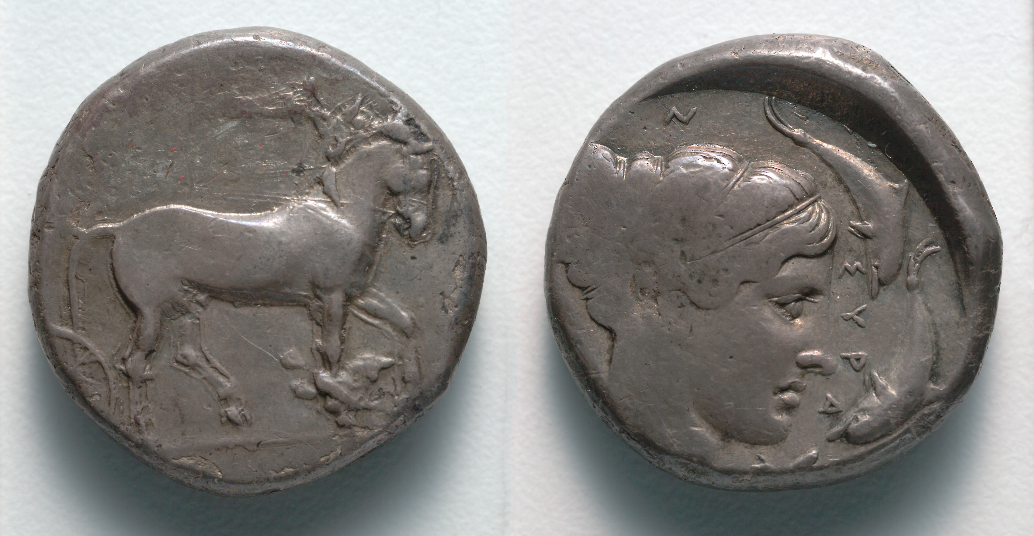 Tetradrachm: Head of Tanit-Persephone (obverse); Horse (reverse)