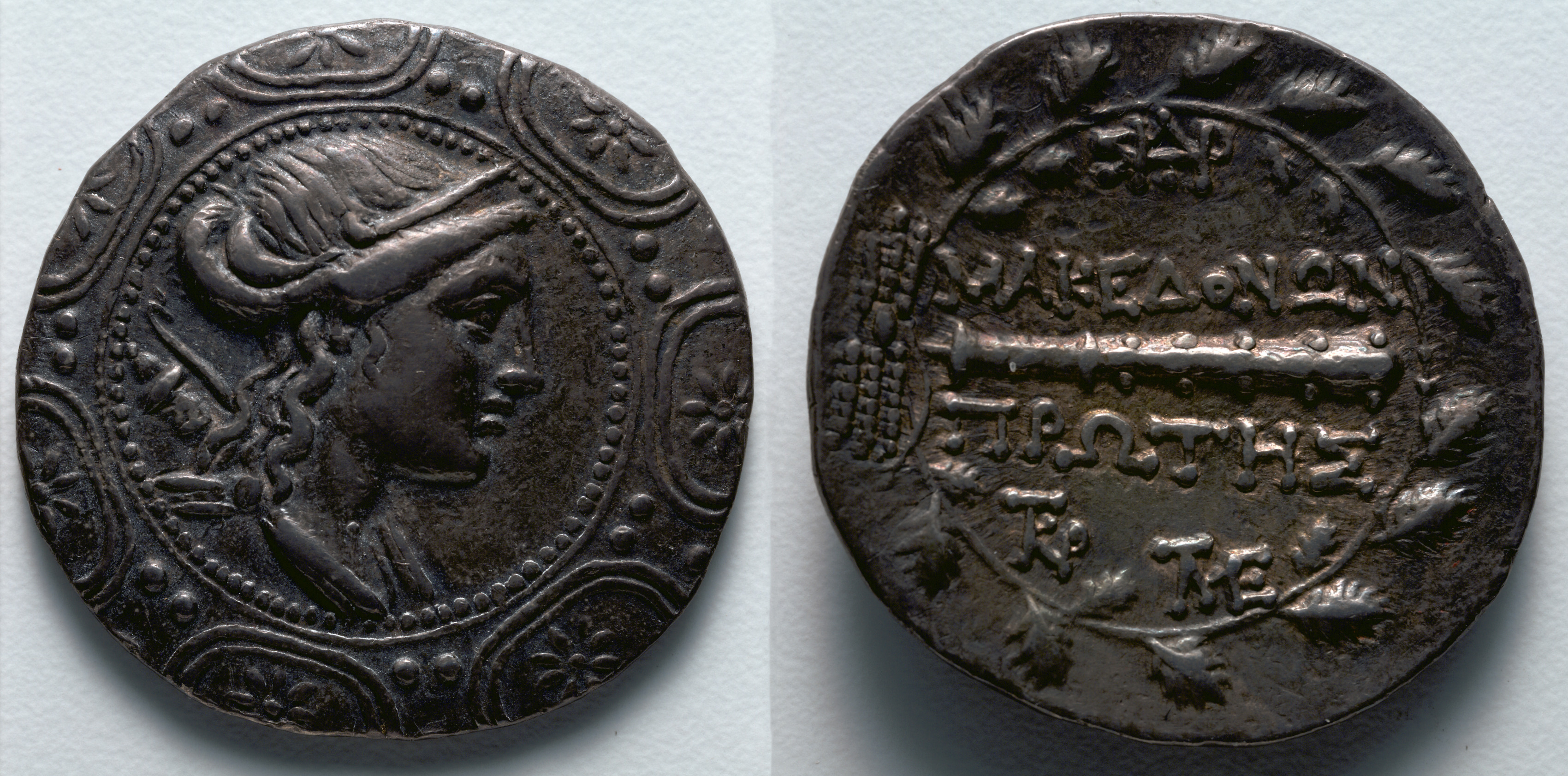 Tetradrachm: Macedonian Shield with Head of Artemis (obverse); Club (reverse)