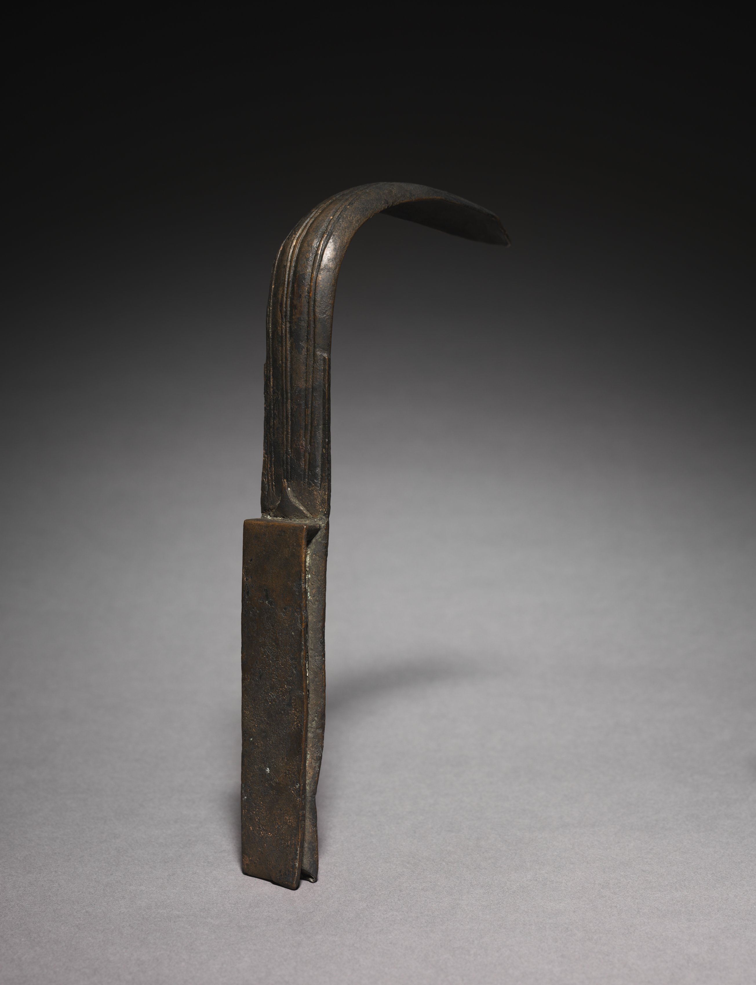 The image depicts a metal object titled Strigil by an unknown artist. The object is made of dark brown metal, likely bronze or iron, with a rectangular base that tapers slightly towards the bottom. The base is approximately 2-3 times thicker than the rest of the object and has a flat bottom. A curved hook extends from the top of the base, resembling a scimitar or a hook. The hook's end is rounded and smooth. The background is a gradient transitioning from black at the top to gray at the bottom, with a shadow cast by the object. The object stands upright on a flat surface.
