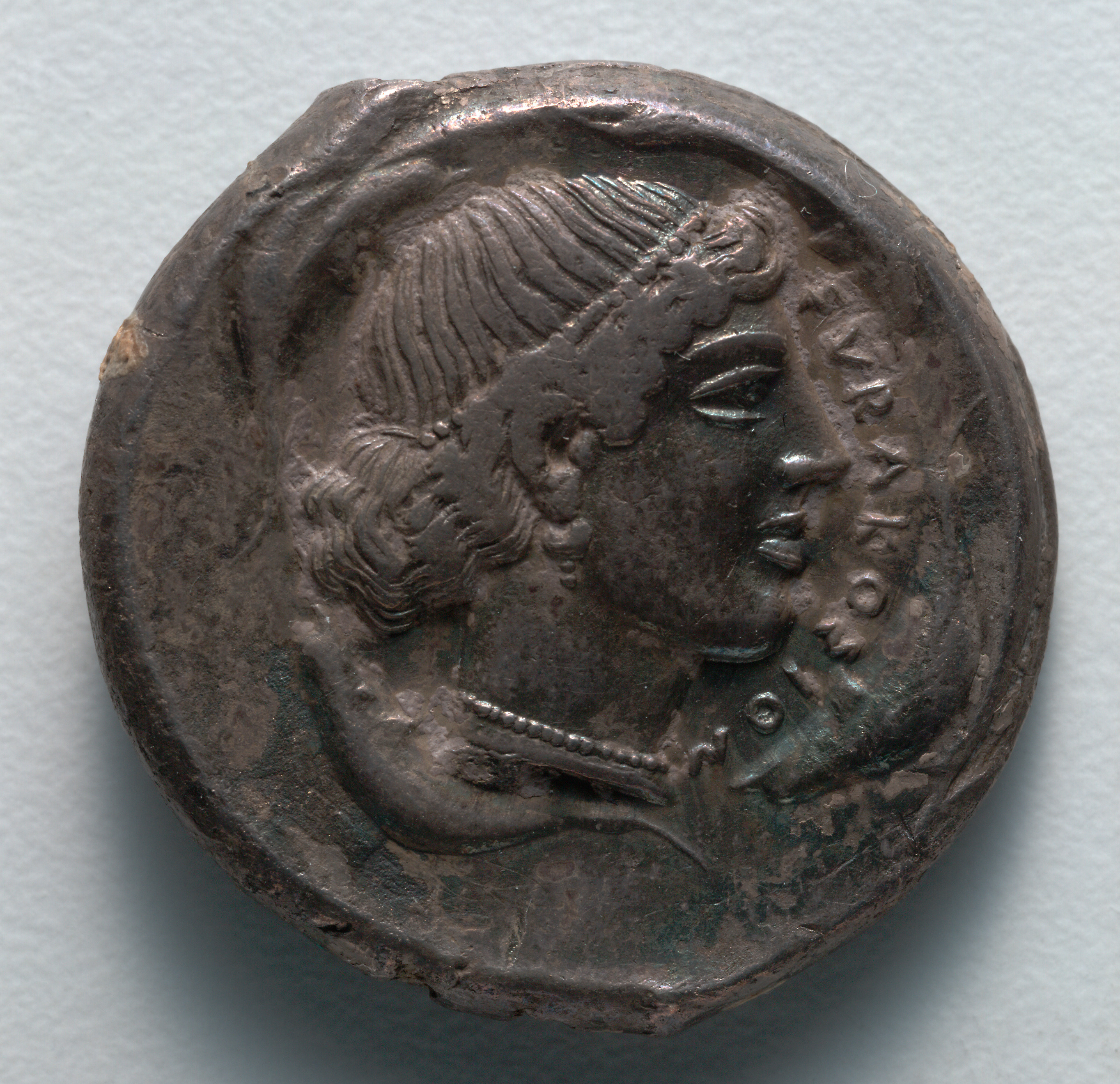 Tetradrachm: Head of Artemis/Arethousa, dolphins (reverse)
