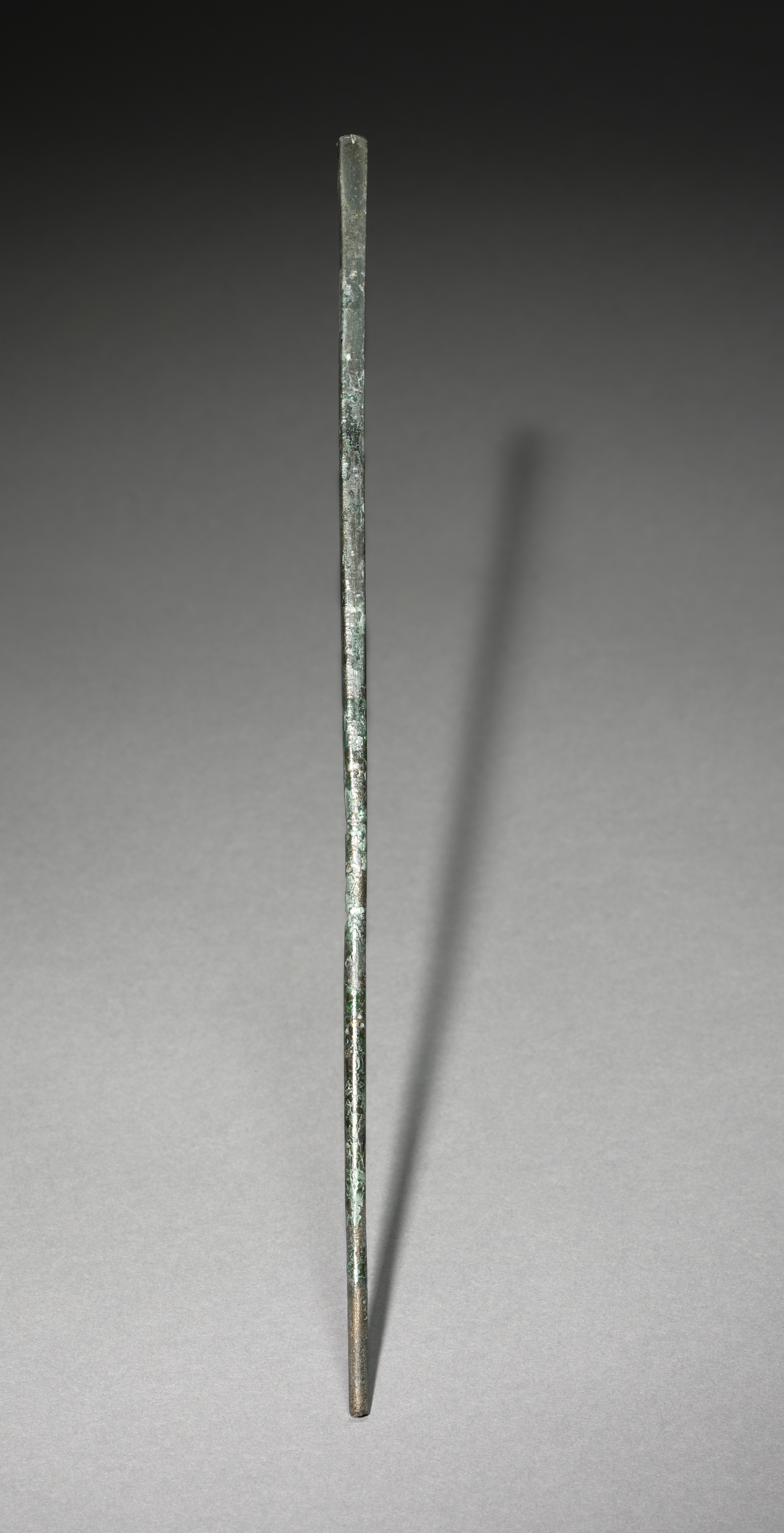 The image depicts Chopstick by artist James Carpenter. The object shown is a long, thin, straight metal stick with a pointed end. The metal is weathered, showing signs of aging with a greenish patina. It has a rough texture and appears to be made of bronze or copper. The stick is positioned vertically, with its shadow cast to the right. The background is a gradient from dark gray at the top to light gray at the bottom.