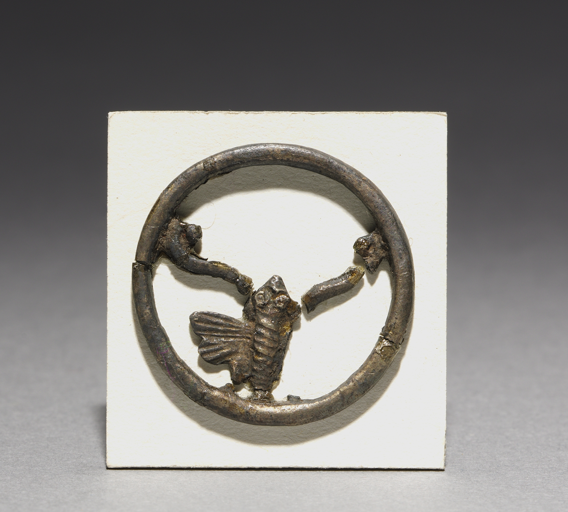 Ornament with Bat Design by unknown artist. The object is circular with a thick border. A bat-like creature is centered within the circle. The creature has wings spread out and appears to be emerging from the bottom. The circle is mounted on a white square. The object appears to be made of weathered metal. The background is dark gray at the top, fading into light gray at the bottom.