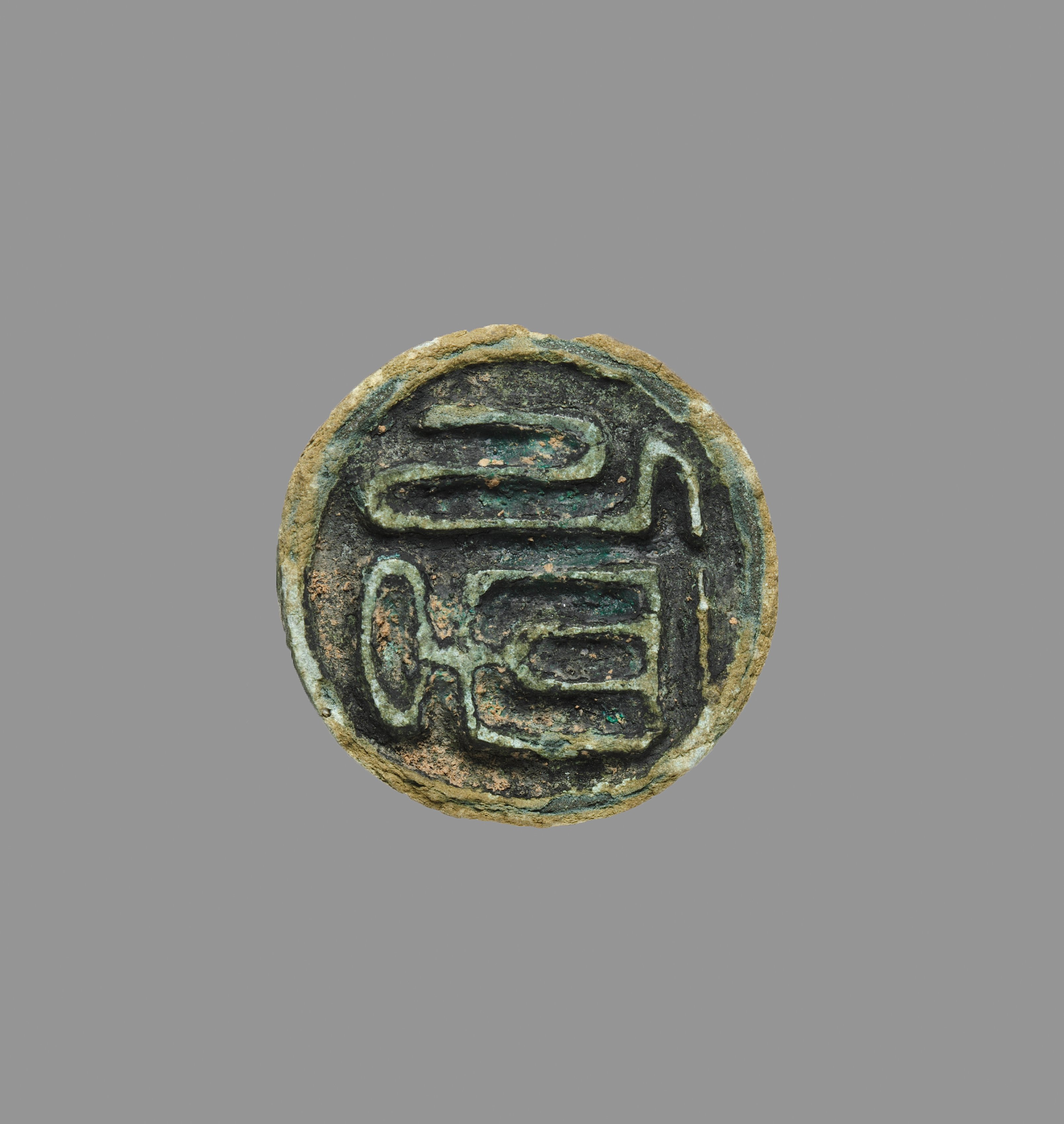Round, flat object with raised design. Green and brown patina. Design appears to be Chinese character. Object appears to be made of metal. Slightly rough edge. Grey background. Title: Seal. Artist: Unknown.