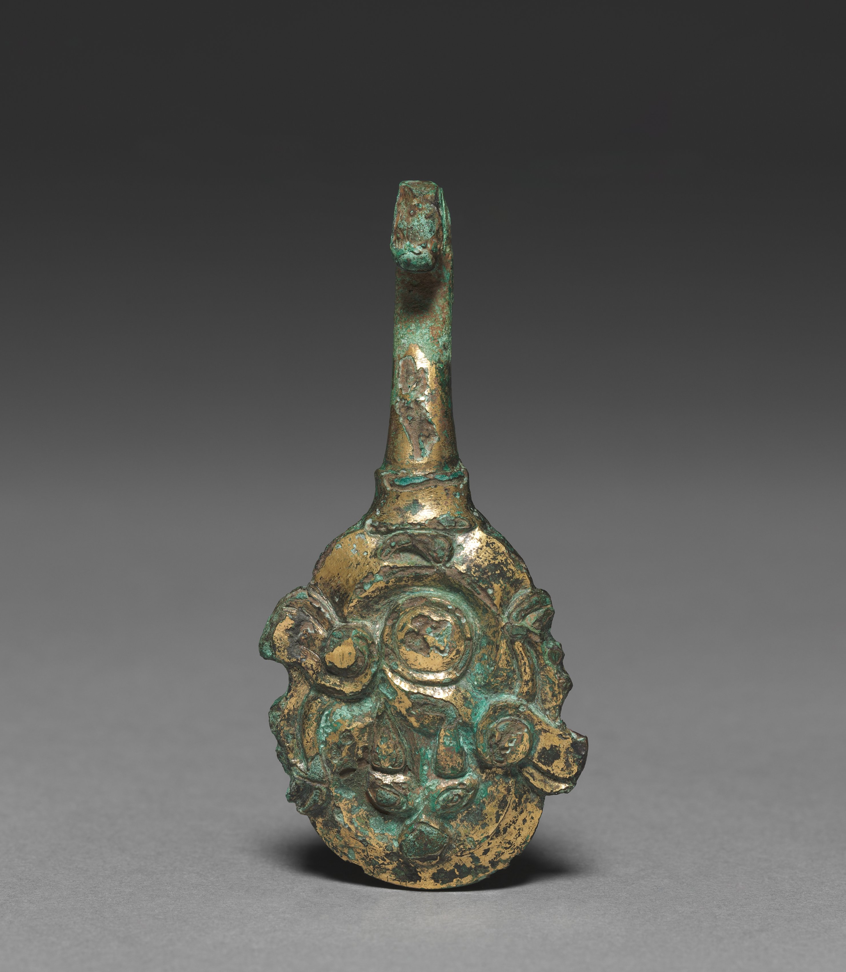 The image depicts a bronze clasp by an unknown artist titled "Clasp". The object is bronze with a green patina. It has a long, thin handle at the top that tapers to a point. The handle is cylindrical and has a small lip at the top. The body of the object is bulbous and decorated with a raised design. The design features a central circle surrounded by curved lines and shapes. The object is positioned on a gray surface, with a dark gray background.