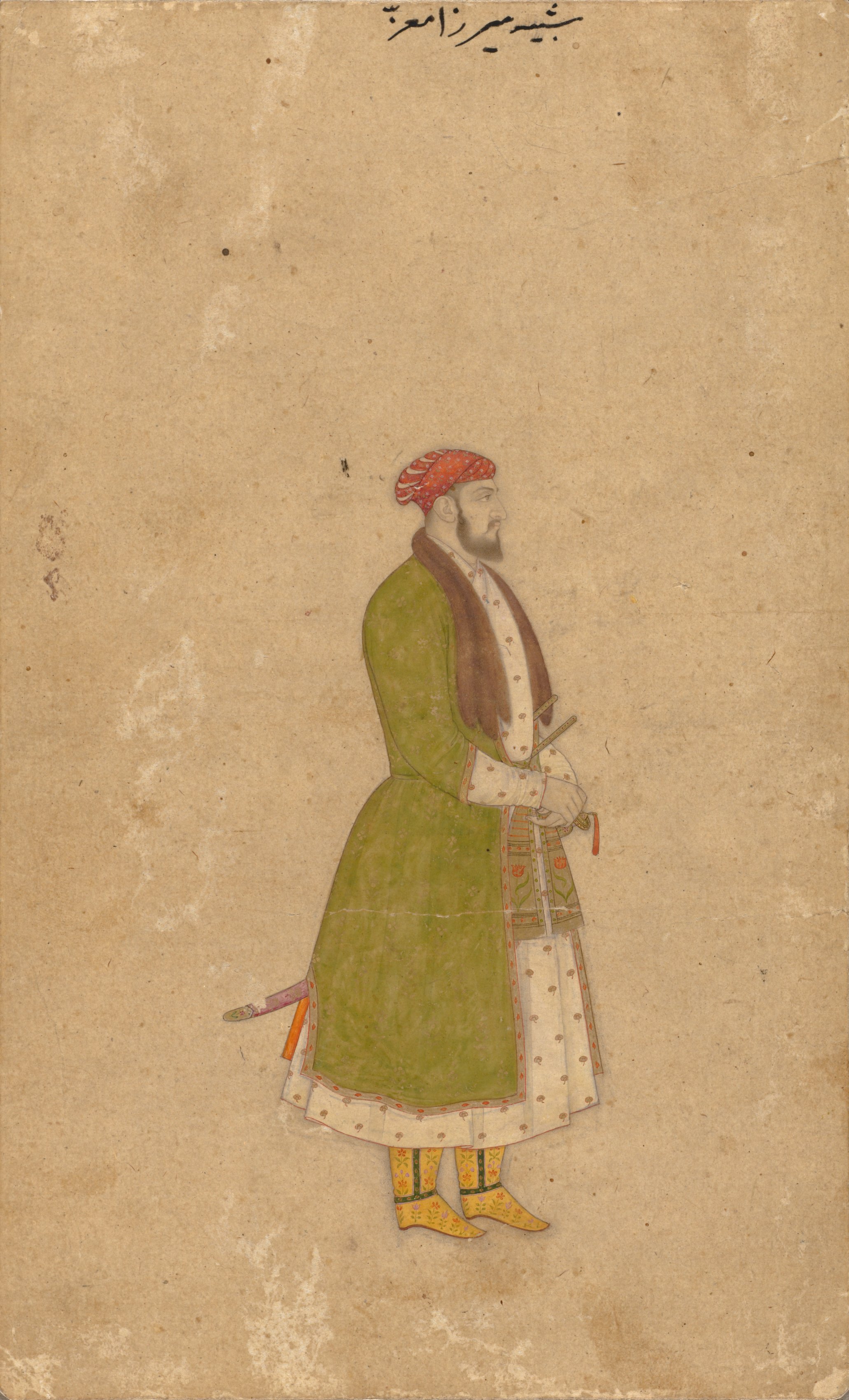 Portrait of the Courtier Mirza Muizz by an unknown artist. The portrait depicts a standing man facing right. He wears a red turban with white accents, a long green robe with brown trim and white lining with gold dots, and a white shirt with gold dots. Over the green robe, he has a brown sash. He also wears yellow boots with a green stripe and a white robe underneath with gold dots. A sword with a pink and orange handle is visible behind him. The background of the image is a mottled tan color with some darker spots and stains, and there is black writing at the top.