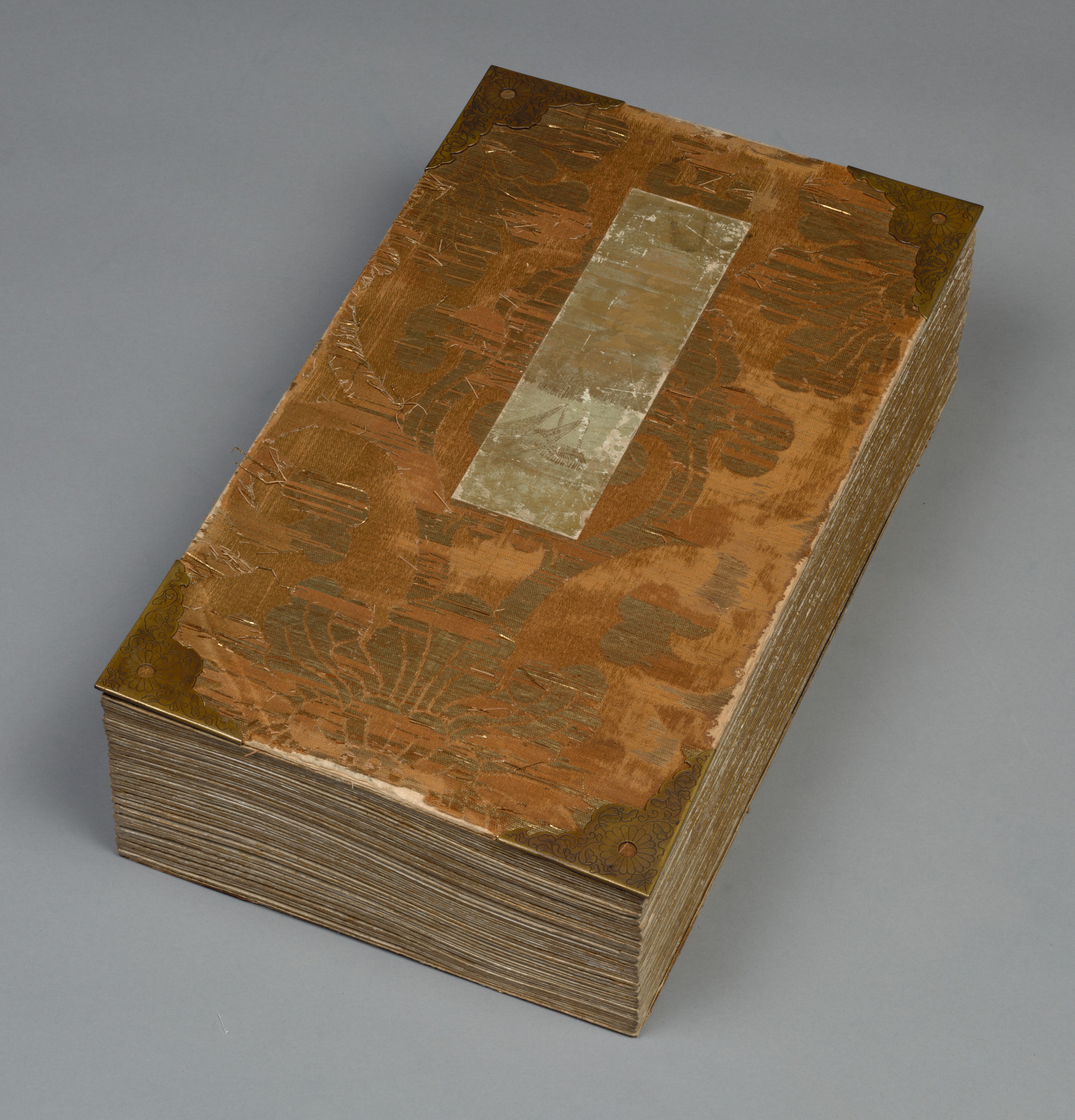 Brown book with rectangular shape. Long rectangle on the cover. A brown and tan pattern on cover. Brown edges. Gray background. Title: Album of Textile Samples. Artist: Unknown.