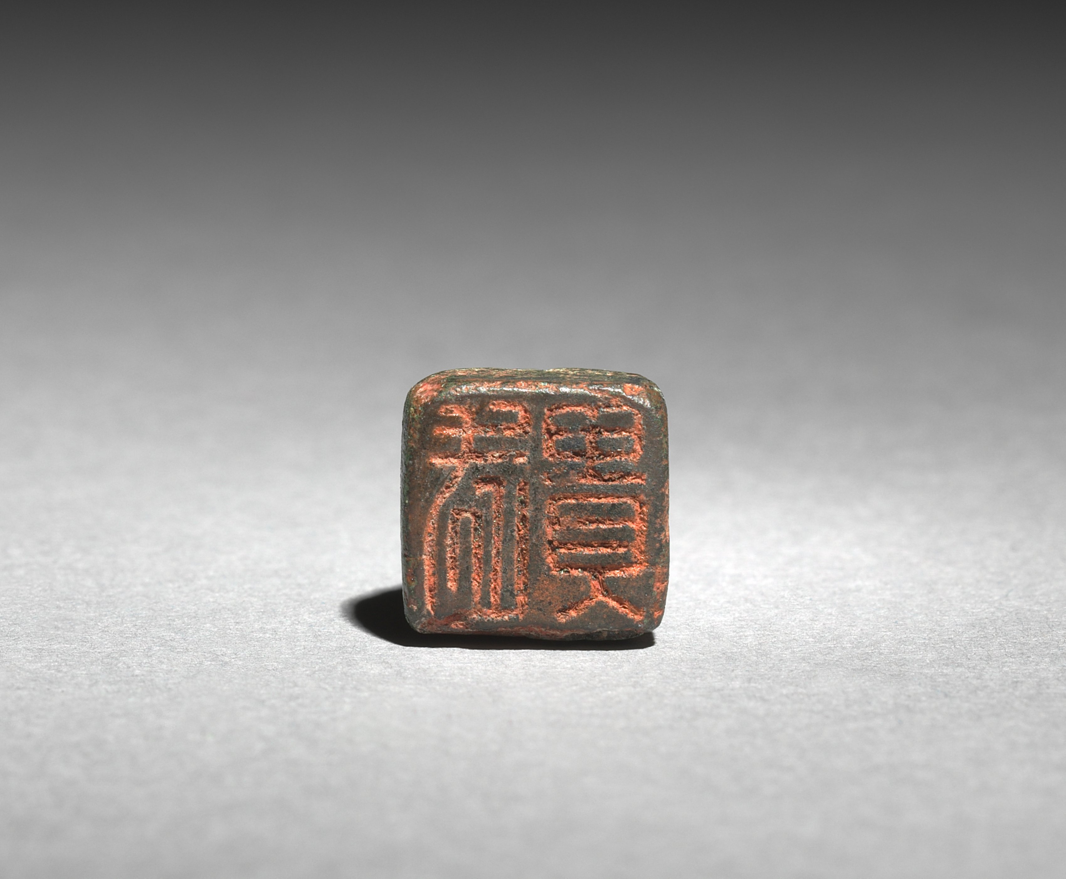 The image shows a square object with rounded corners made of a reddish-brown material, likely stone or clay, with a darker brown patina. The object has a carved design on all sides. The design consists of four symbols arranged in a 2x2 grid. The background is a gray surface with a darker gray gradient at the top. A shadow is cast to the left of the object. The title is "Seal" by the artist Seal. The object appears to be an ancient seal.