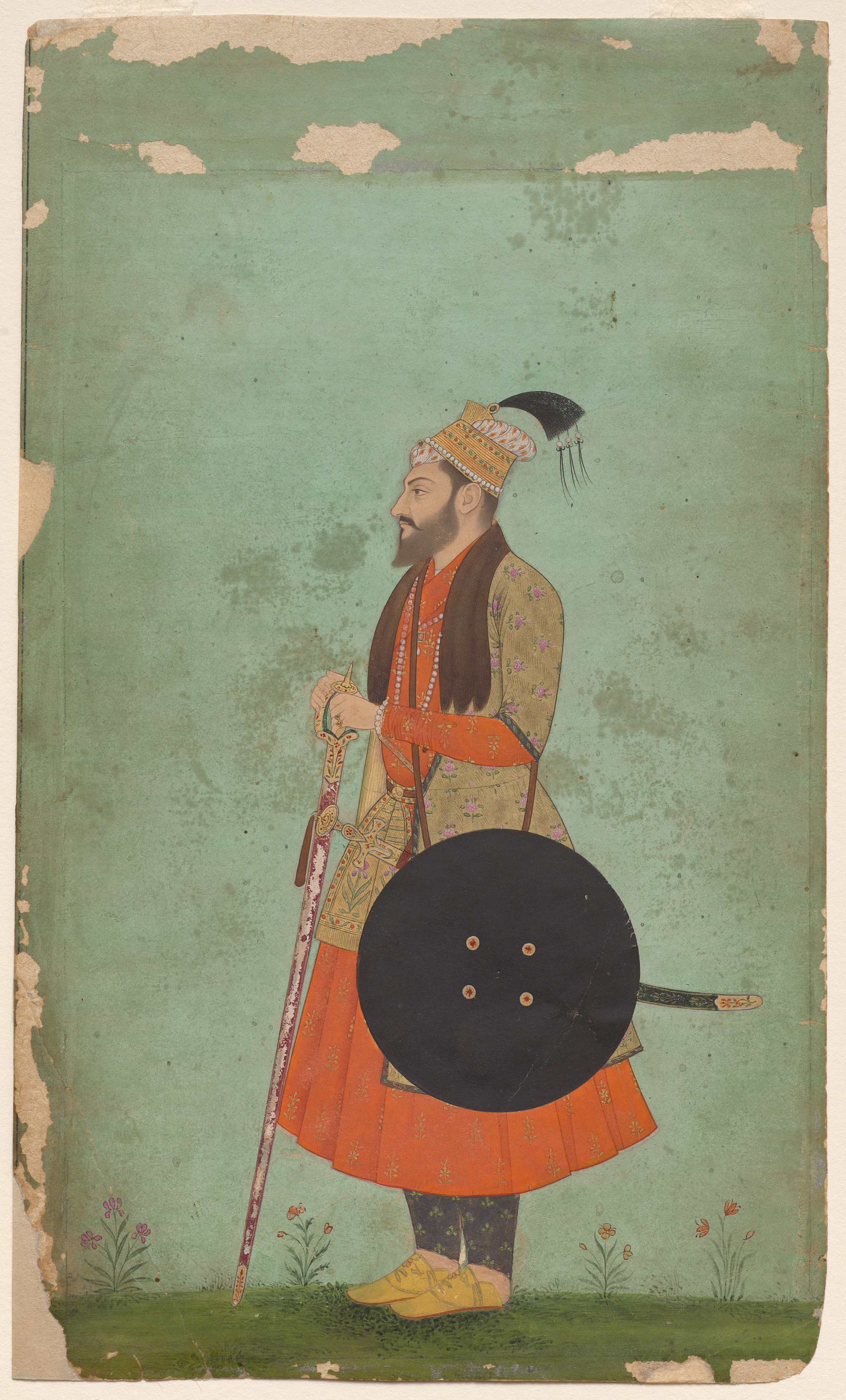 The image depicts a man in profile, facing left. He wears a long, orange and gold robe with long sleeves and a flared hem. A brown shawl with pink flowers drapes over his shoulders. His head is covered with a tall, pointed hat adorned with gold, white, and black decorations, including a long black feather. He holds a staff in his right hand and a black shield with gold accents in his left. The man's dark hair and beard are visible. He wears yellow shoes. The background is a muted green with spots of discoloration and peeling along the edges. Small flowers are painted along the bottom edge. The man stands on a green surface.
