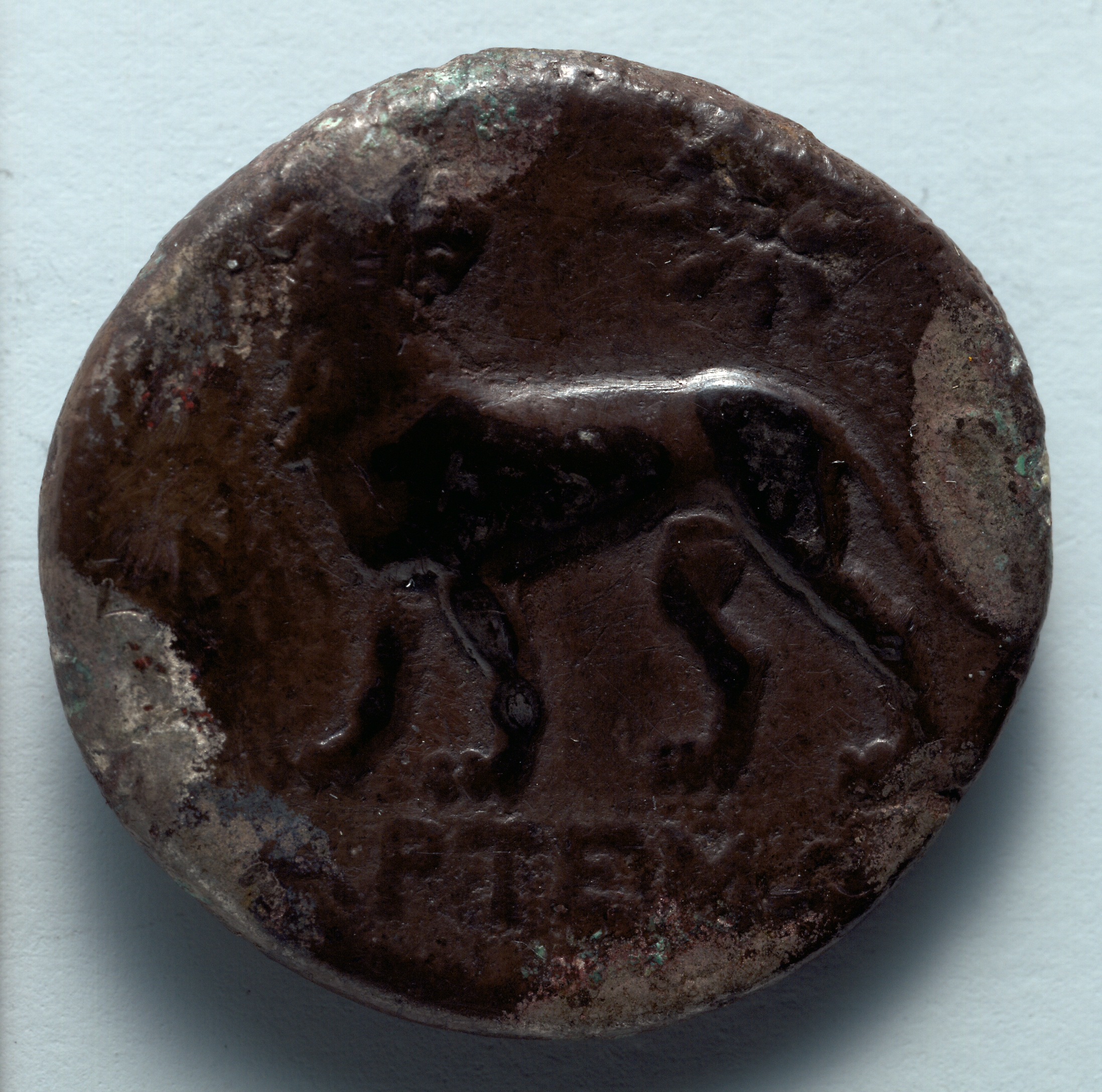 Brown coin with lion walking to the right. The lion's head is facing the right. The coin appears to be made of a dark brown metal with visible signs of aging and wear, with green spots near the edges, and has a circular shape.