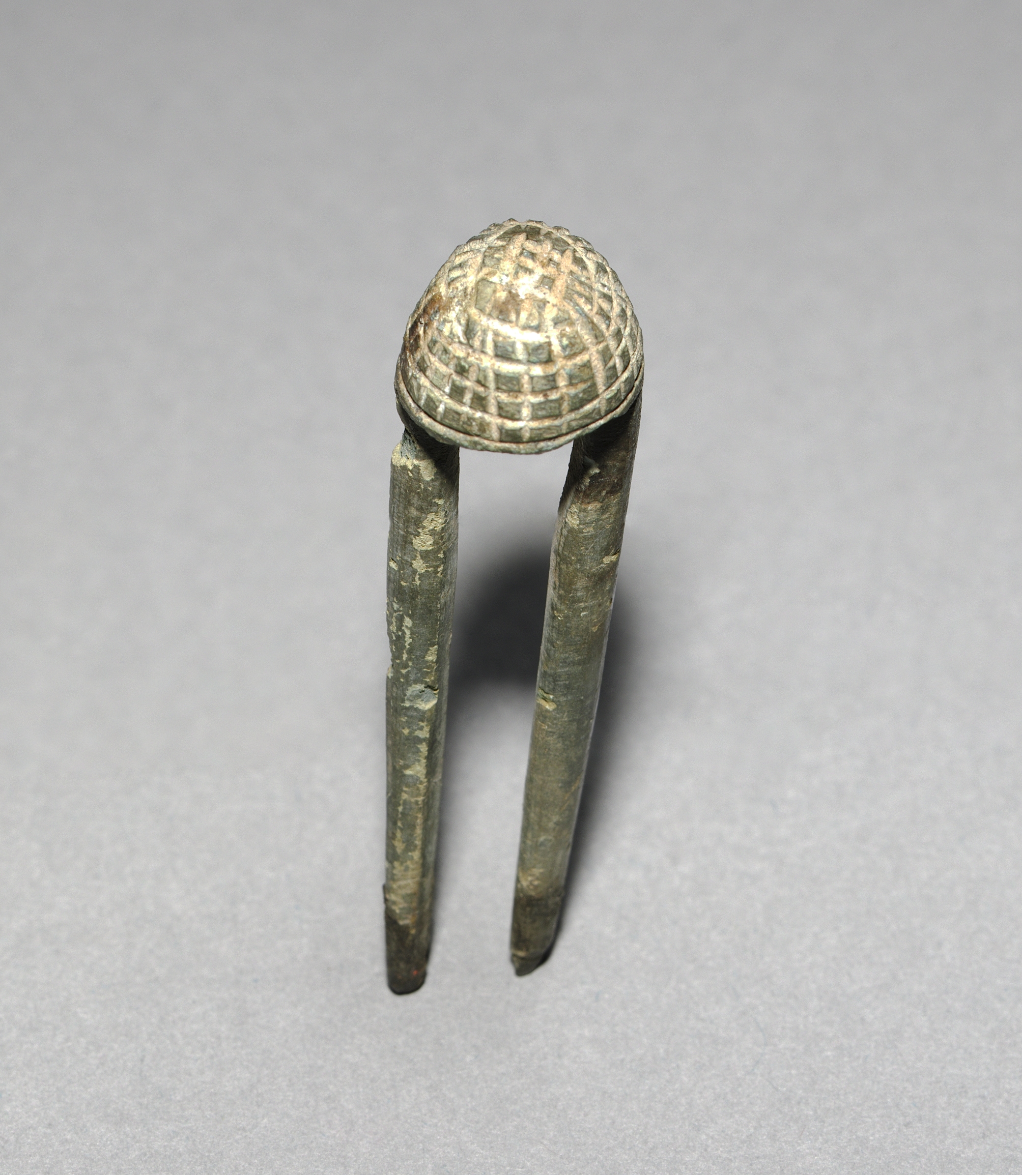 Metal hairpin with a rounded top, silver with a checkered pattern etched into the top. The pin has three long prongs. The metal is weathered with spots of green. Background is gray. Title: Topknot Pin. Artist: Unknown.