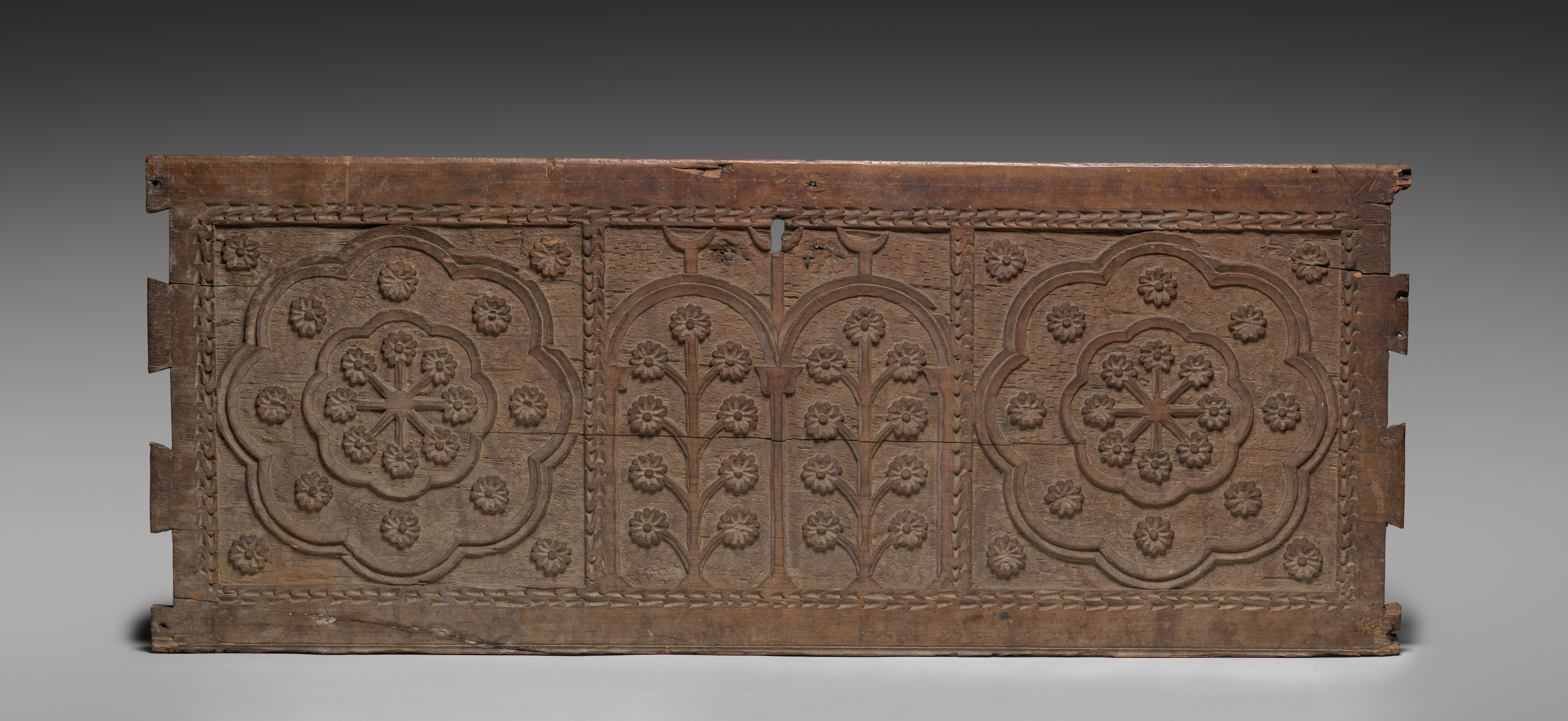 The image depicts a chest front titled "Chest Front" by the artist. The chest front is rectangular and made of dark brown wood. It features a carved border around the edges. The main panel is divided into three sections. The left and right sections have a flower-like design with rounded edges and a central flower surrounded by smaller flowers. The middle section has an arched design with a tree-like pattern. The background of the image transitions from dark gray at the top to light gray at the bottom. The chest front sits on a light gray surface. The overall appearance suggests an old, intricately carved wooden chest front.
