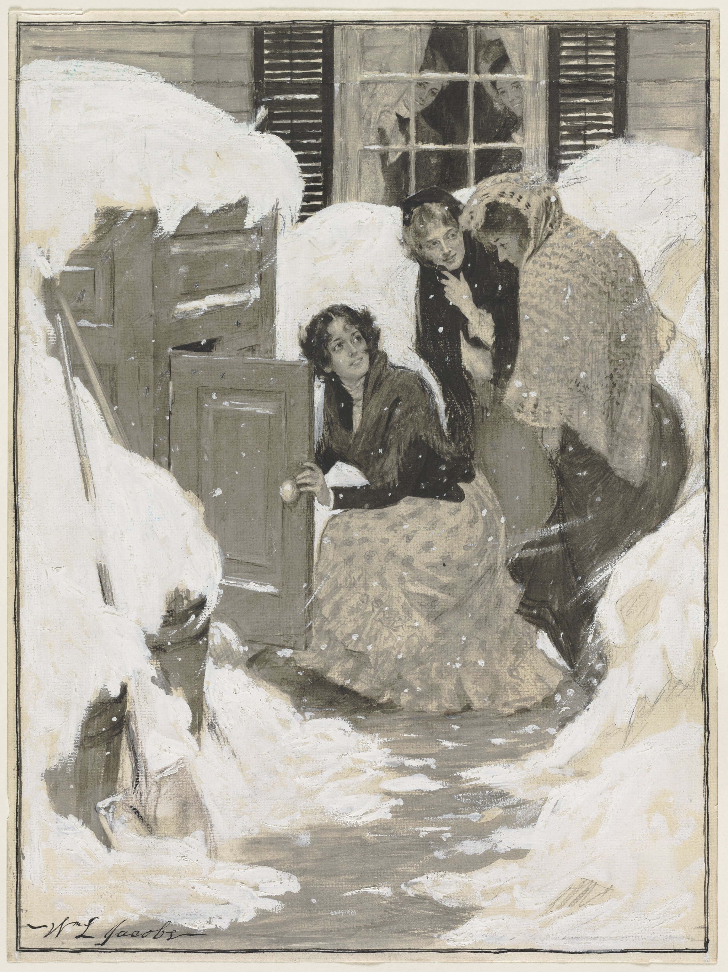 Black and white sketch of three people outside a house. The people are dressed in old fashioned clothing, with one woman sitting on the steps and two people standing over her. The woman sitting on the steps wears a long skirt and jacket; she faces right and looks over her left shoulder. The person on the right is a woman wearing a headscarf; she bends toward the seated woman. The person on the left is a child; they wear a hat and coat; they look through a window. The house has a window with nine panes and open shutters on either side; two additional people are visible through the window, looking out. The steps and yard are covered in snow; snow falls around the people. The artist's signature appears in the bottom left. The title of the sketch is "Sketch for a Book Illustration." The artist is William Leroy Jacobs.