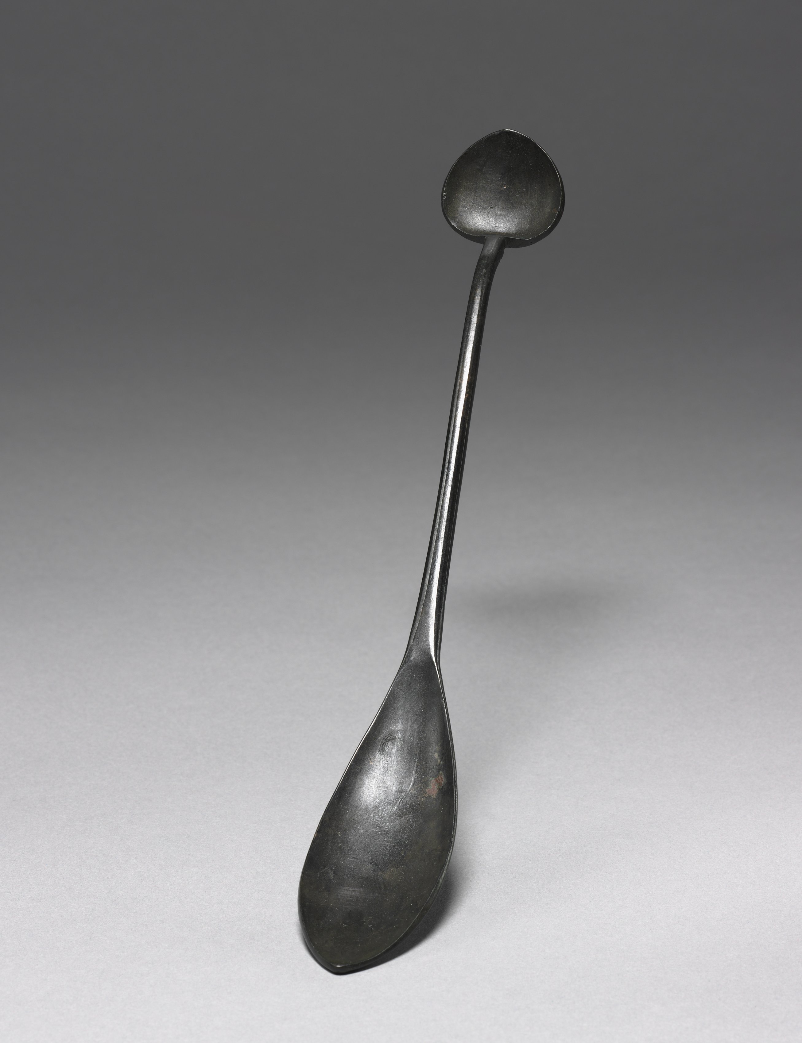 Dark gray metal spoon with two heads, one at the top and one at the bottom, connected by a long handle; both heads are teardrop shaped; background fades from dark gray at top to light gray at bottom; shadow cast to right. Title: Spoon with Dual Heads Artist: Not specified.