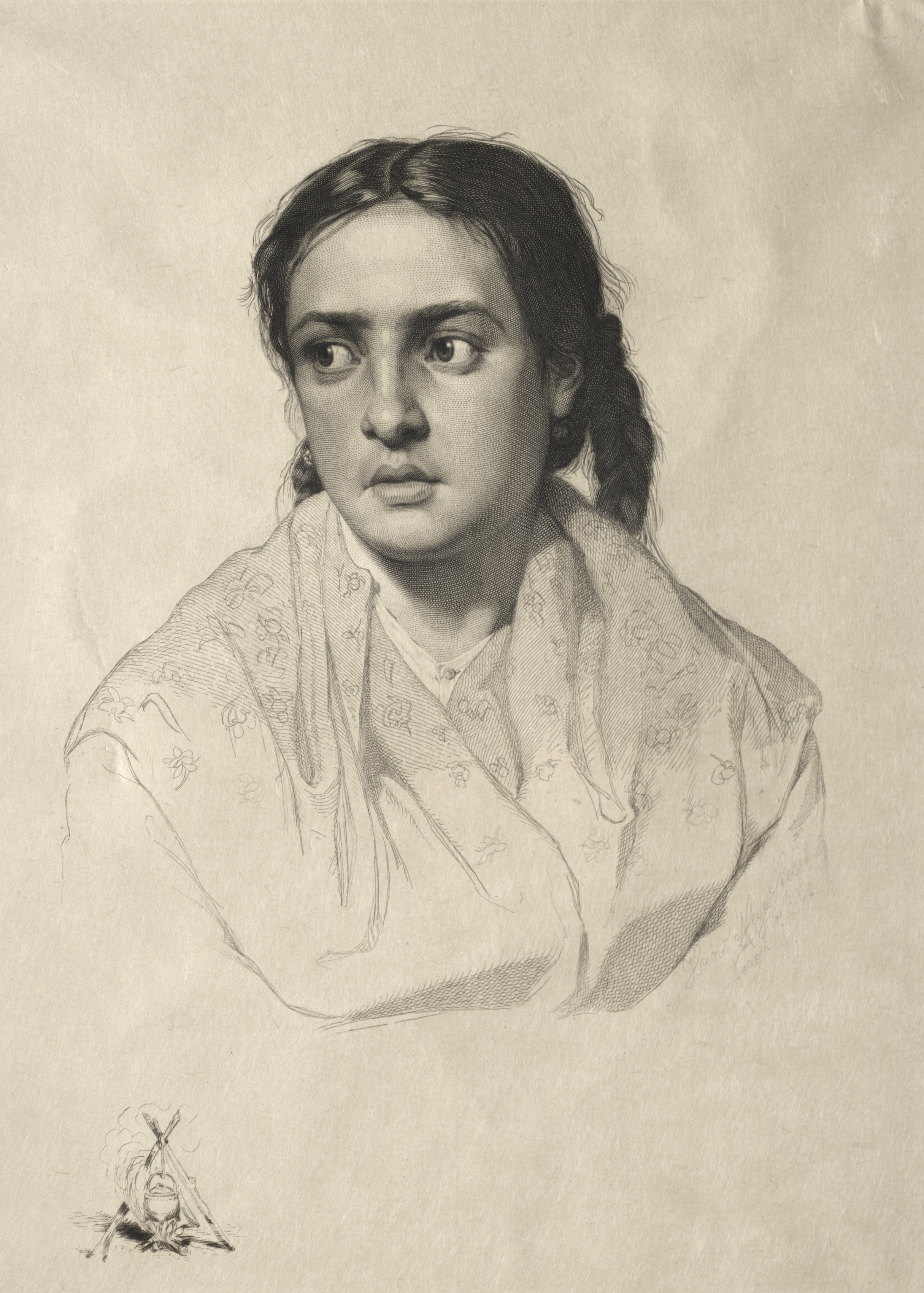 The image is a black and white drawing of a woman's head and shoulders. The woman has dark hair pulled back into a low ponytail. Her hair is parted in the middle and hangs down on either side of her face. She is wearing a shawl with a floral pattern around her neck. The shawl appears to be draped over her shoulders and chest. The woman is looking directly at the viewer with a neutral expression. Her eyebrows are slightly furrowed. She has a small nose and full lips. The background of the drawing is a light beige color. There is a small signature in the bottom-left corner of the image. The signature appears to be a simple line drawing of a hut or tent. The title of the piece is "Head of a Girl" and it was created by Hans Meyer.
