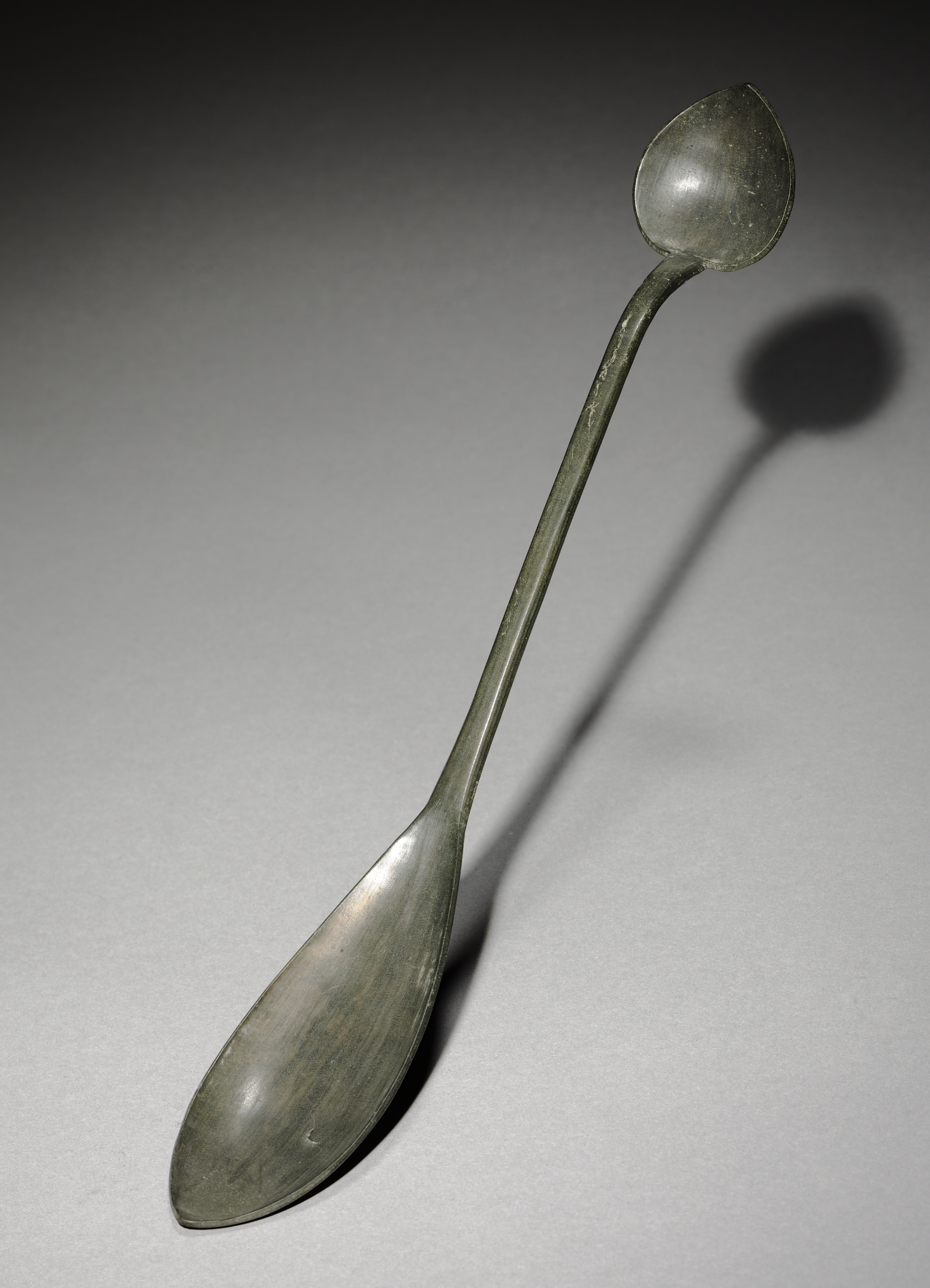 Spoon with Dual Heads by Lenka. Metal spoon with two heads, one at each end. The head at the top is teardrop-shaped and relatively small. The lower head is elongated and oval. The spoon has a long handle connecting the two heads. The background is gray with a shadow cast to the right.