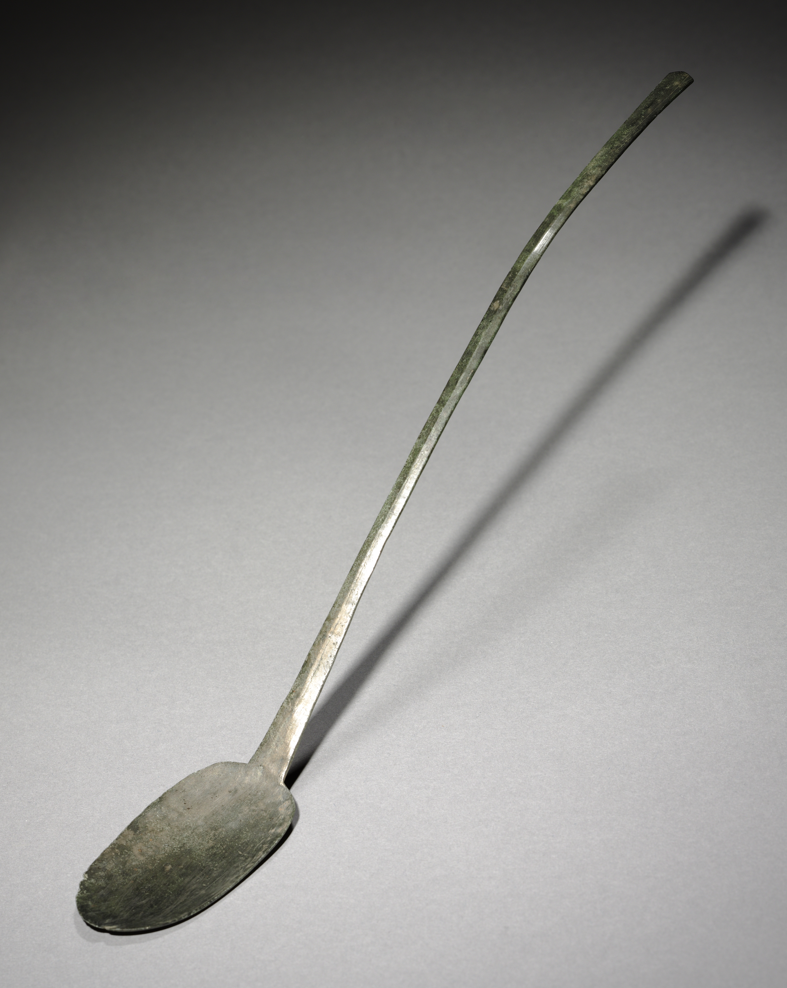Spoon by Spoon. Metal spoon with long handle and oval-shaped bowl, exhibiting a greenish patina, against a gray background with a shadow cast to the right.