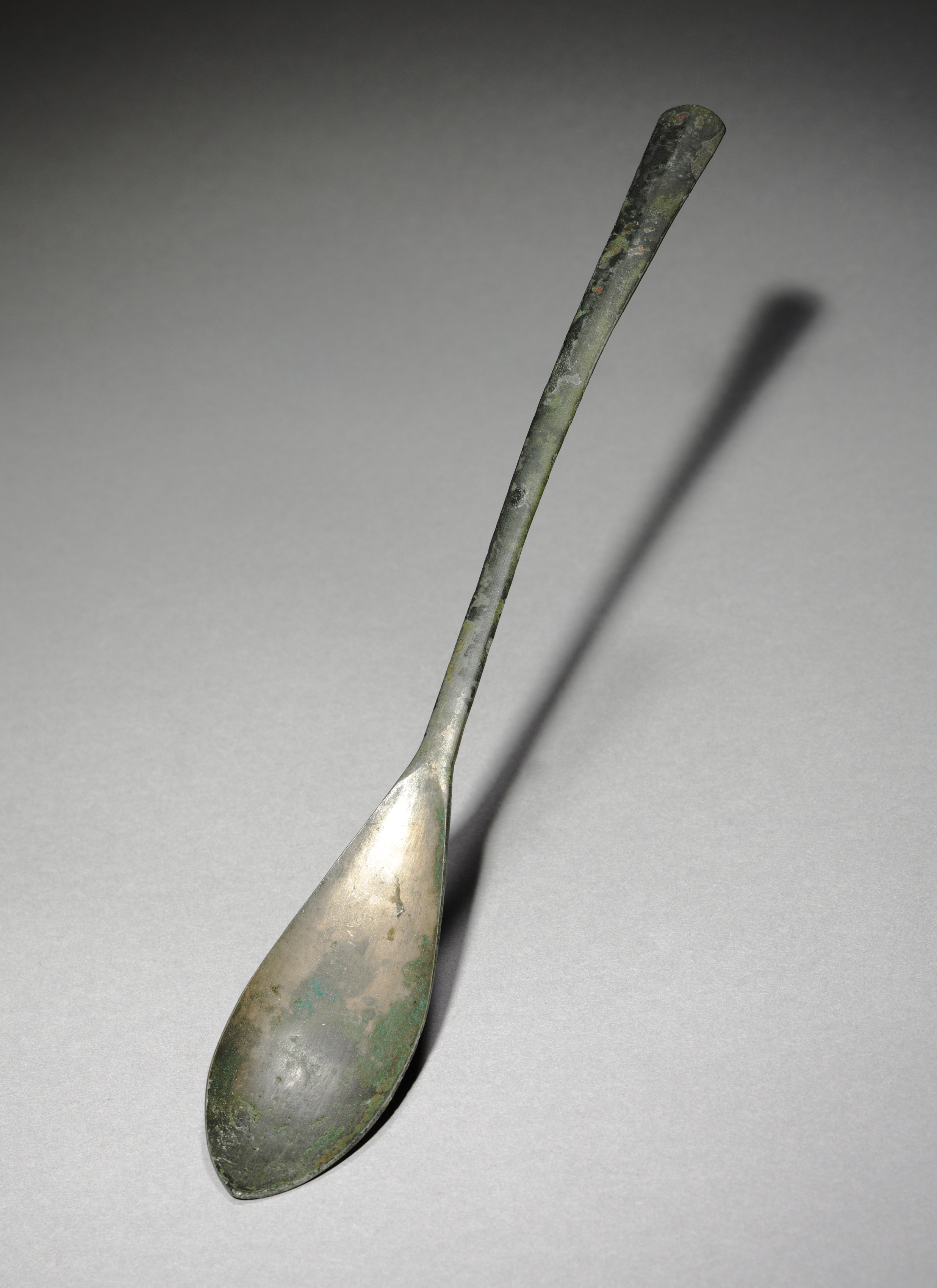 The image depicts a single spoon. The spoon has a long, thin handle that is roughly cylindrical in shape, with a slightly rounded end. The spoon's bowl is oval and tapers to a point. The spoon appears to be made of metal, likely bronze or copper, given its green patina. The spoon exhibits a green and brown patina throughout; the bowl is more silver. The background of the image is a plain gray surface, with a shadow cast by the spoon to the right. The shadow tapers to a point. The image title is "Spoon" by the artist.