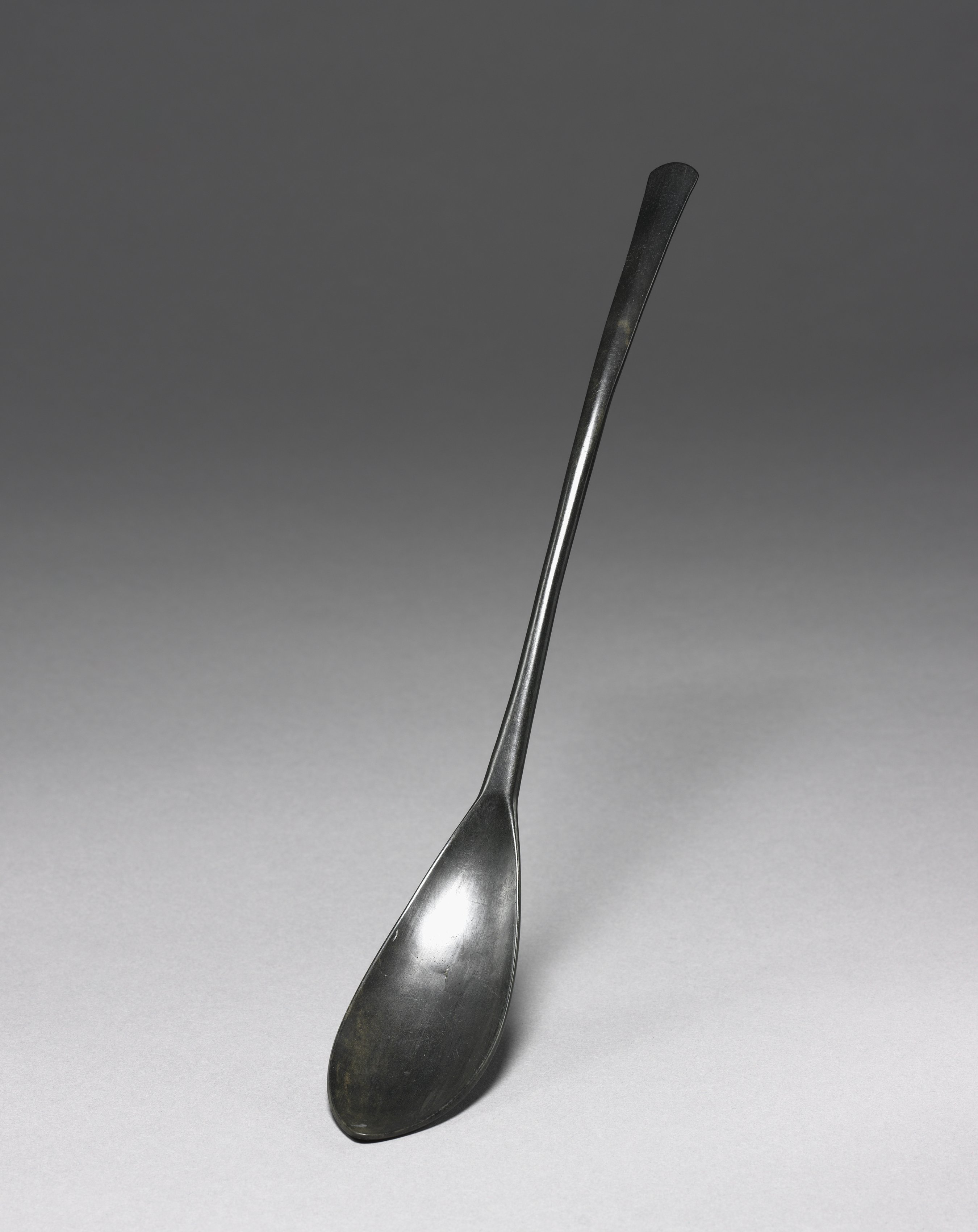 Metal spoon with long handle and oval bowl, pointed at tip. Spoon by artist Spoon.