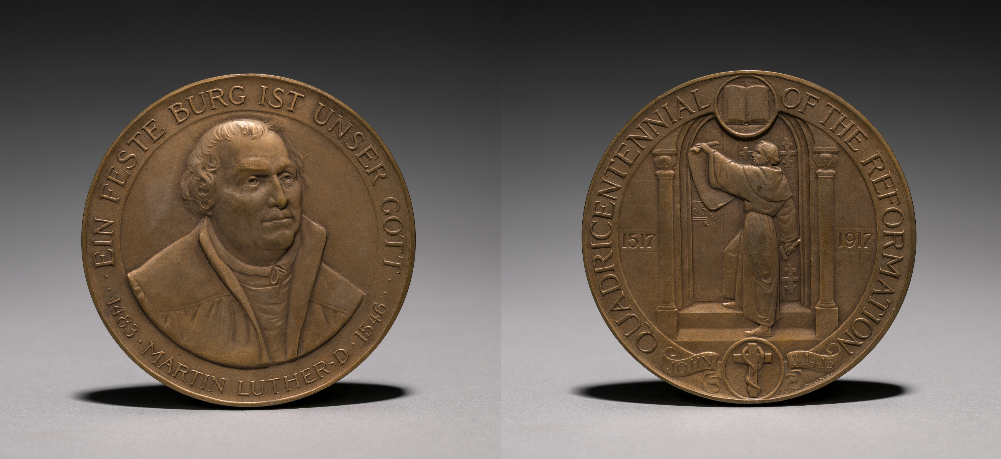 Bronze medal with two sides. The left side features a raised image of an older man with short, curled hair wearing a collared jacket and a shirt with a high collar. The man's image is encircled by text reading "EIN FESTE BURG IST UNSER GO TT" at the top and "1483 MARTIN LUTHER 1546" at the bottom. The right side features a raised image of a man standing in an archway holding a book. The man standing is dressed in a long robe. He stands behind a lectern. Two people stand behind him. The archway has a rounded top. The text around the top of the right side reads "QUADRICENTENNIAL OF THE REFORMATION". The years "1517" and "1917" are on either side of the archway. The medal's background is a gray gradient.