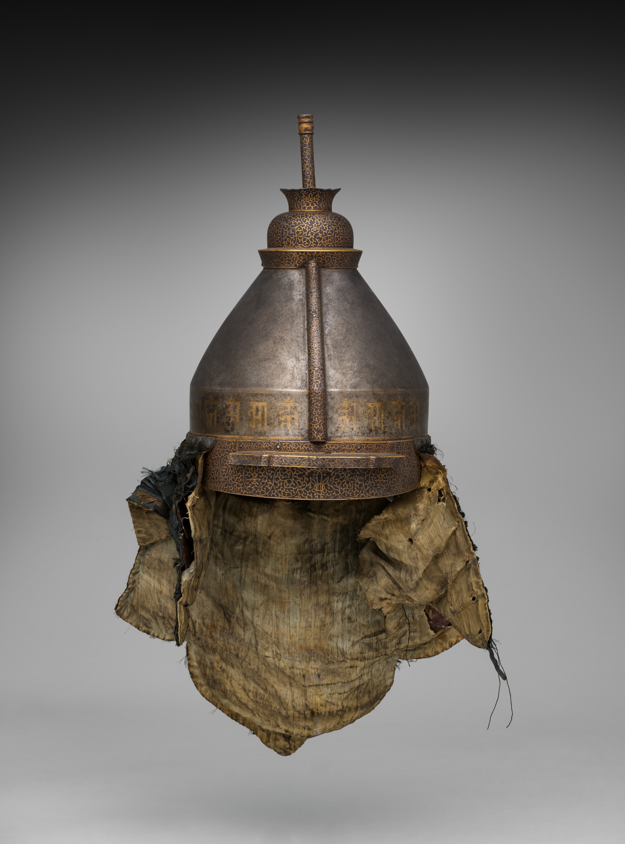 Helmet by Mervyn Williams. A bronze helmet with a conical top and a short finial. The helmet has a decorative gold band around the base with some writing on it. The helmet also has a decorative gold design on the top. A piece of leather or fabric hangs from the bottom of the helmet. The background is grey.