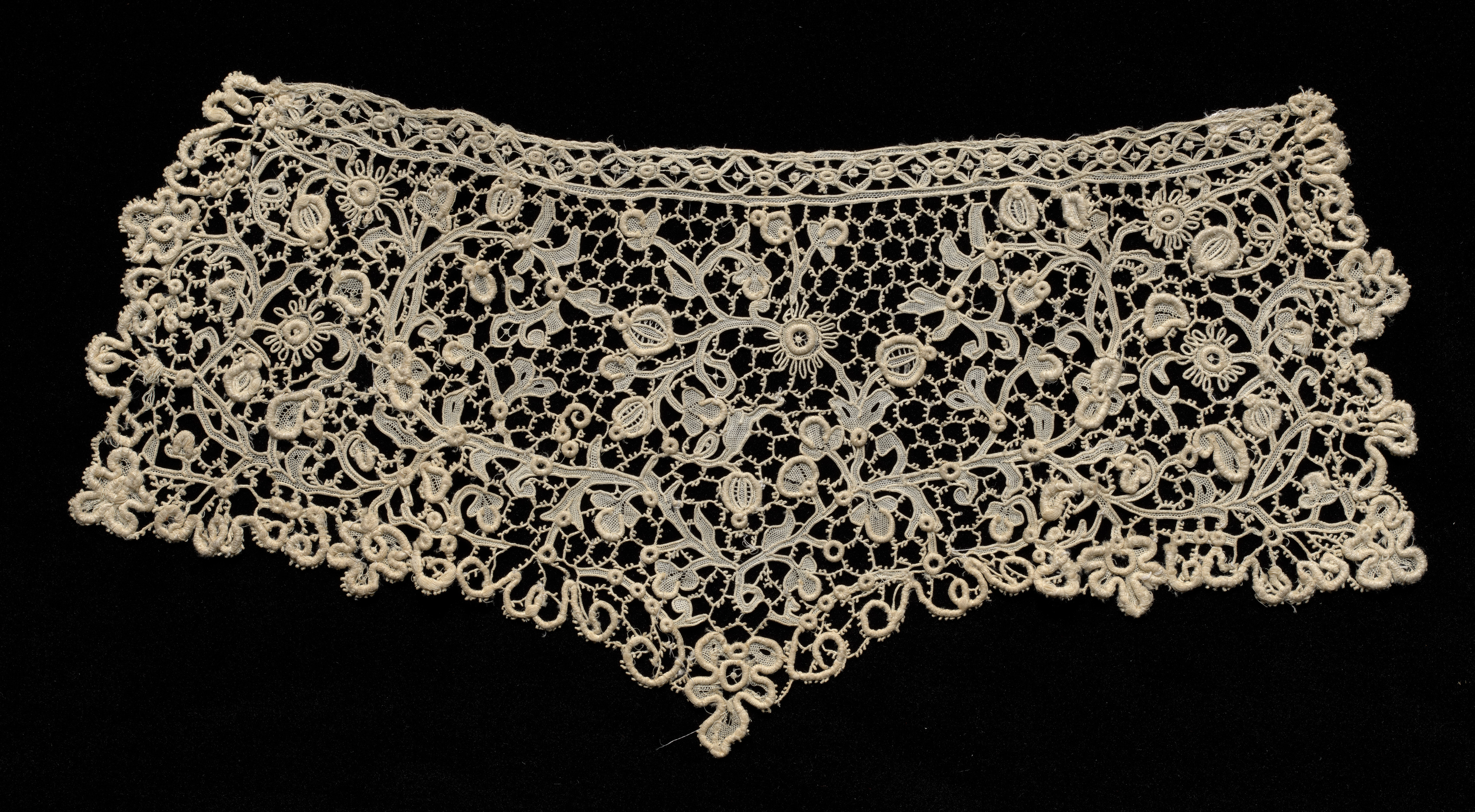 The image depicts a piece of off-white lace against a black background. The lace appears to be made of a thin, delicate material. The lace is shaped like a cuff and features a floral pattern with intricate designs throughout. The top edge of the lace is scalloped and has a decorative border. The bottom edge also features a decorative border with a floral design in the center. The lace has a vintage appearance. The lace cuff is titled "Needlepoint (Venetian Rose Point) Lace Cuff (One of a Pair)" and is by an unnamed artist.