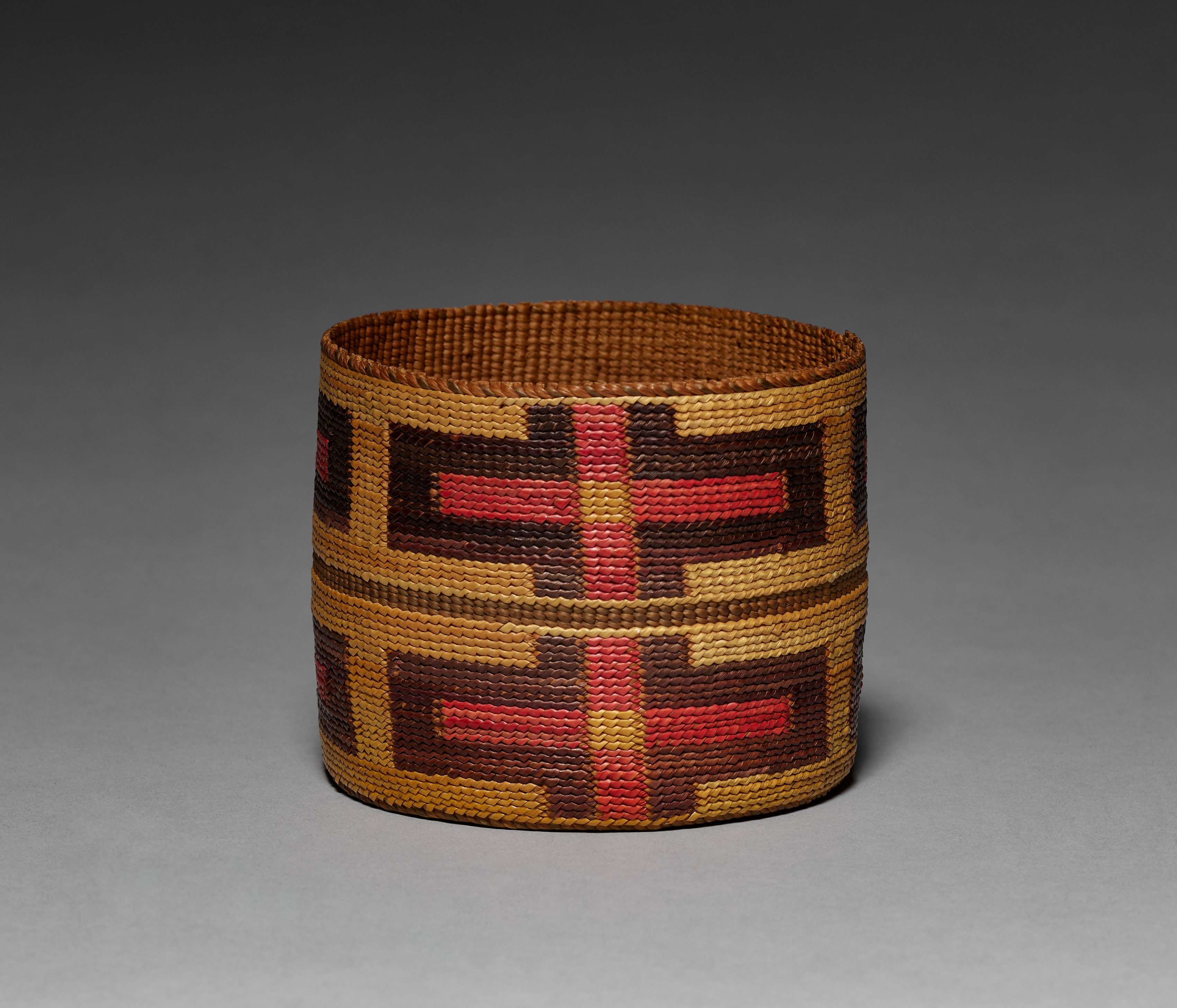 Telescoping basket by an unknown artist. The basket is cylindrical with a flat bottom and straight sides. It has a light brown base color. The basket features a pattern of red, dark brown, and light brown geometric shapes resembling a cross or plus sign. The pattern consists of two rows of interconnected designs. The background of the image is a gradient of dark gray to light gray. The basket appears to be made of woven material, possibly wood or plant fibers. The image shows the basket from a slightly angled front view.