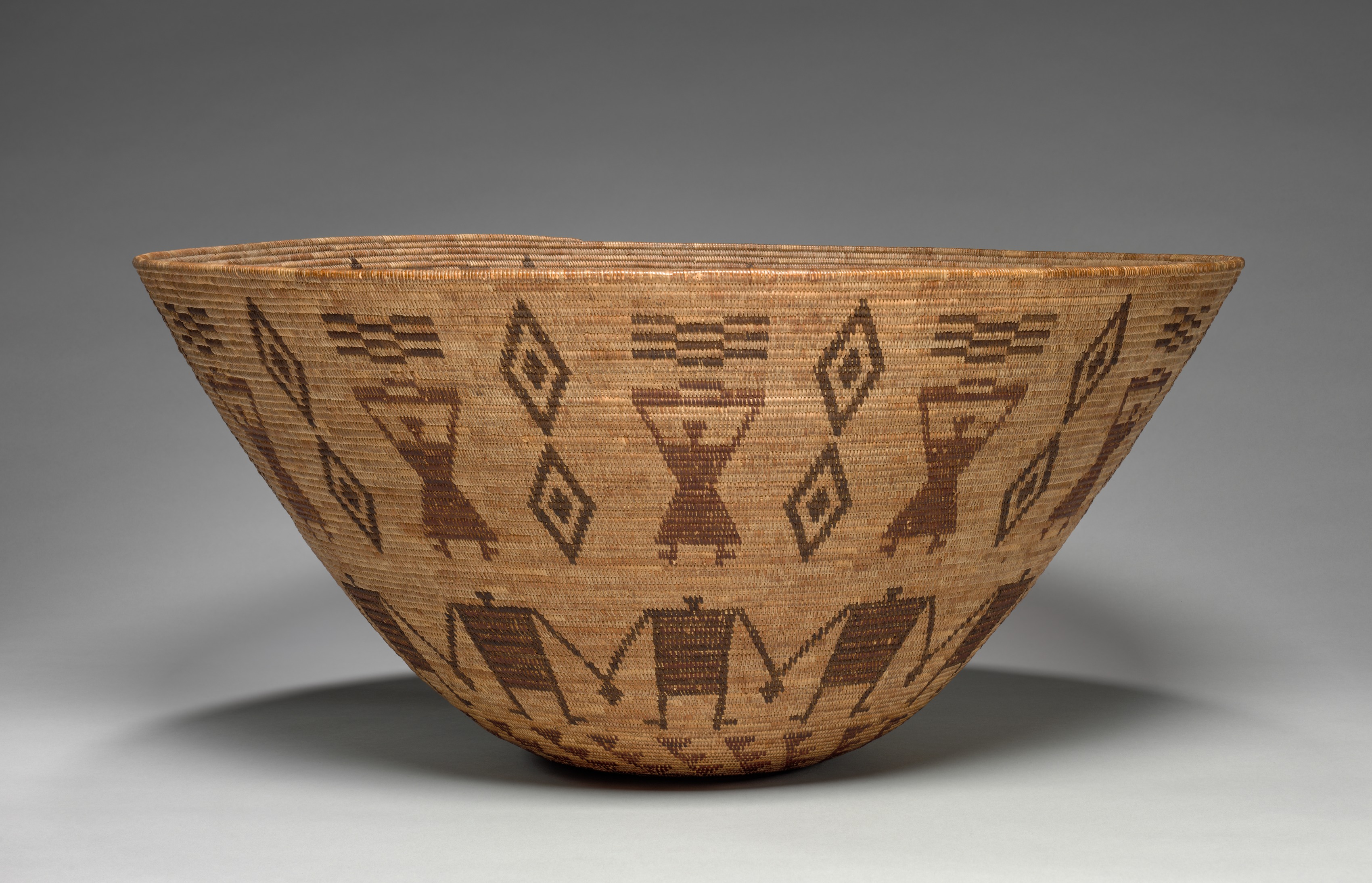 Tan woven bowl with dark brown designs. Wide, conical shape. Flat bottom. Dark brown designs are triangular, symmetrical, and abstract. Diamond shapes are present. Horizontal lines and geometric shapes are also present. Light source from the front. Shadow on the surface below. Grey background. Presentation Bowl by an unknown artist.