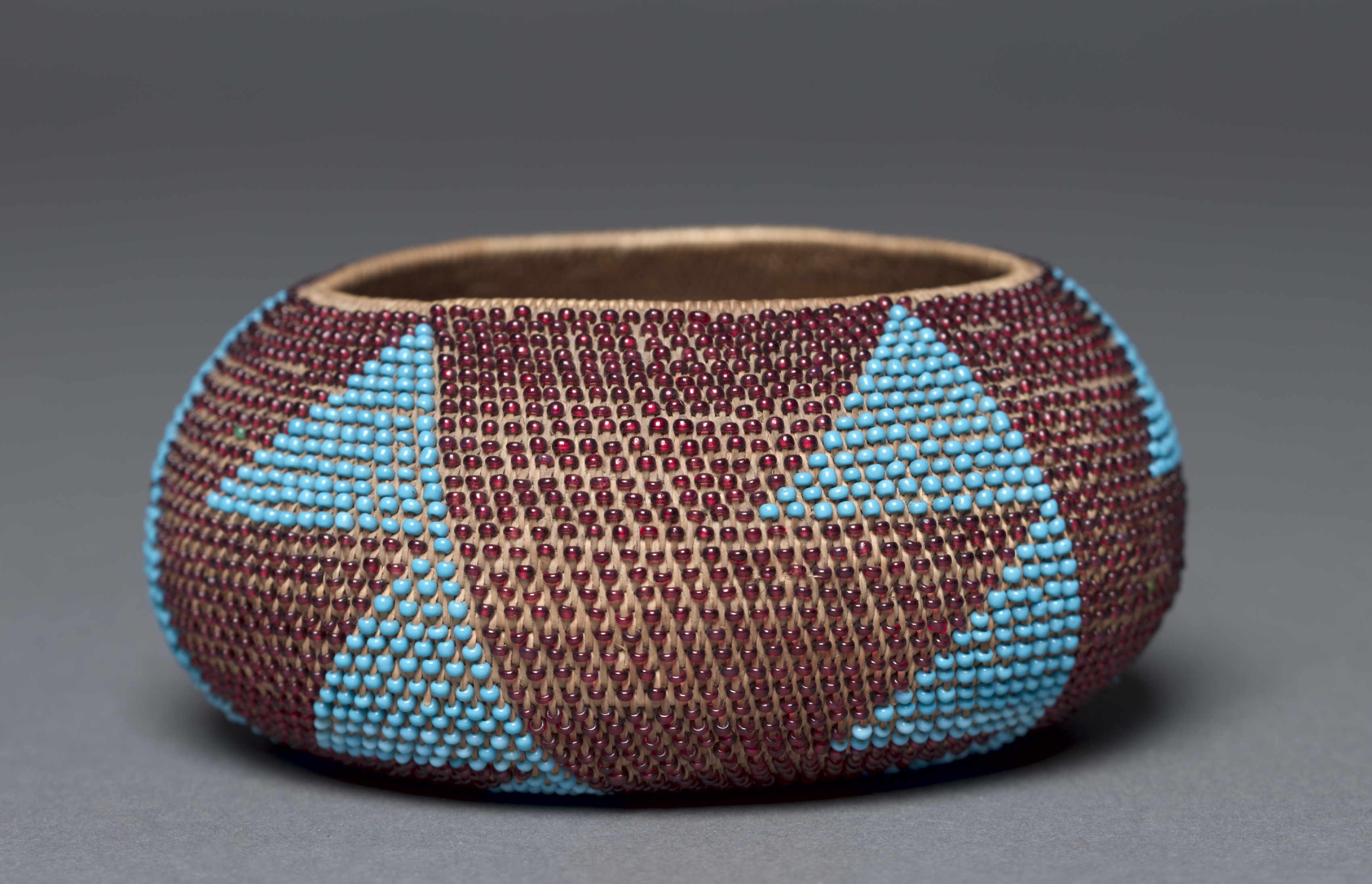 The Gift Bowl by an unknown artist is a small, rounded vessel with a wide mouth. The bowl's exterior is covered in beads of various colors, predominantly red and blue, arranged in a geometric pattern. The beads form four triangular sections of blue beads pointing towards the center, alternating with sections of red beads. The bowl sits on a gray surface against a gray background. The interior of the bowl is not beaded, showing the natural material, likely wood or woven fibers, beneath. The bowl's base is not visible, suggesting it may be resting on a flat surface or a stand. The overall appearance suggests a handmade, decorative piece.