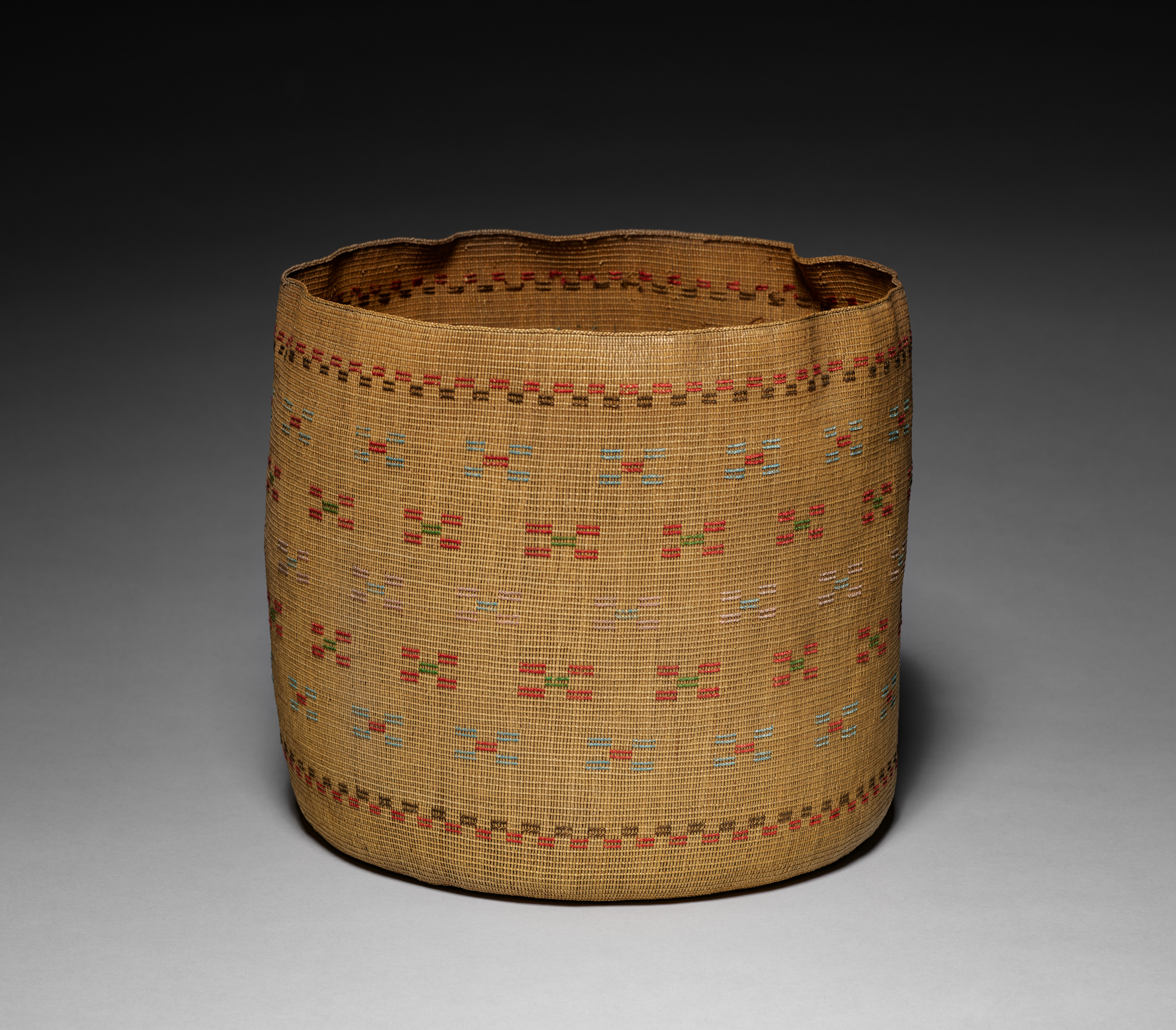 Twined Cylindrical Basket by the artist. Tan woven basket with small red, green, blue and brown square patterns throughout; top and bottom have thin rows of patterning; top edge irregular; cylindrical shape.
