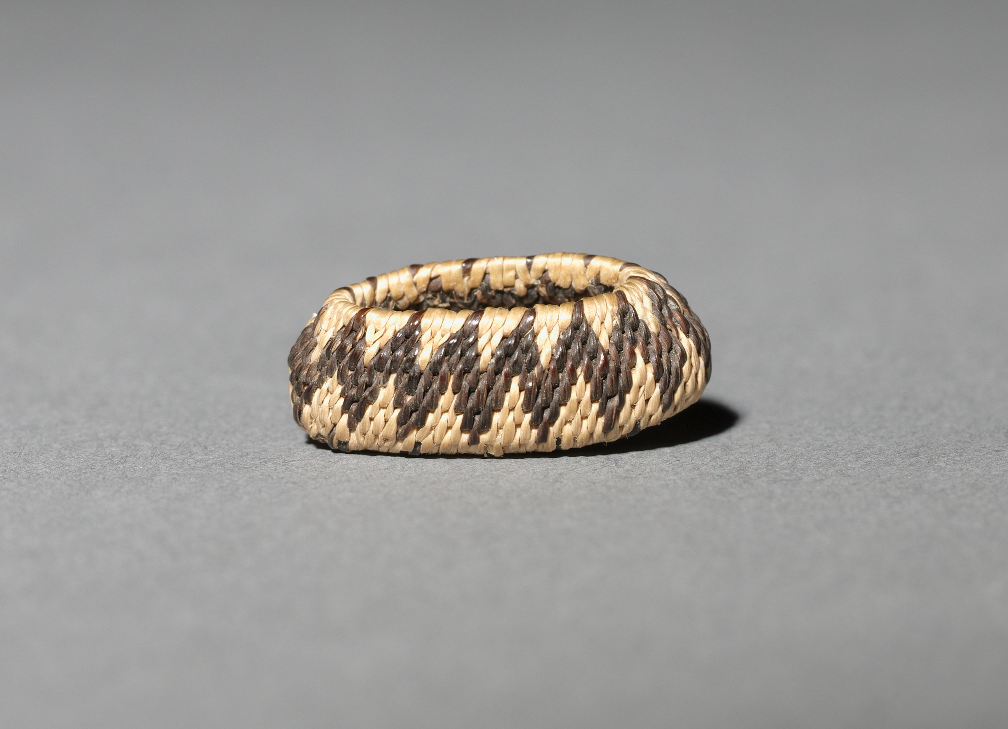 Miniature Rhomboidal Basket by an unknown artist is a small, oval-shaped woven basket. The basket has a flat bottom and slightly curved sides. It features a pattern of alternating dark and light-colored strips woven together, creating a rhombus-like design. The light-colored strips are beige, while the dark strips are brown. The basket's rim is slightly thicker and more rigid than the rest of the basket. The background of the image is a solid gray color.