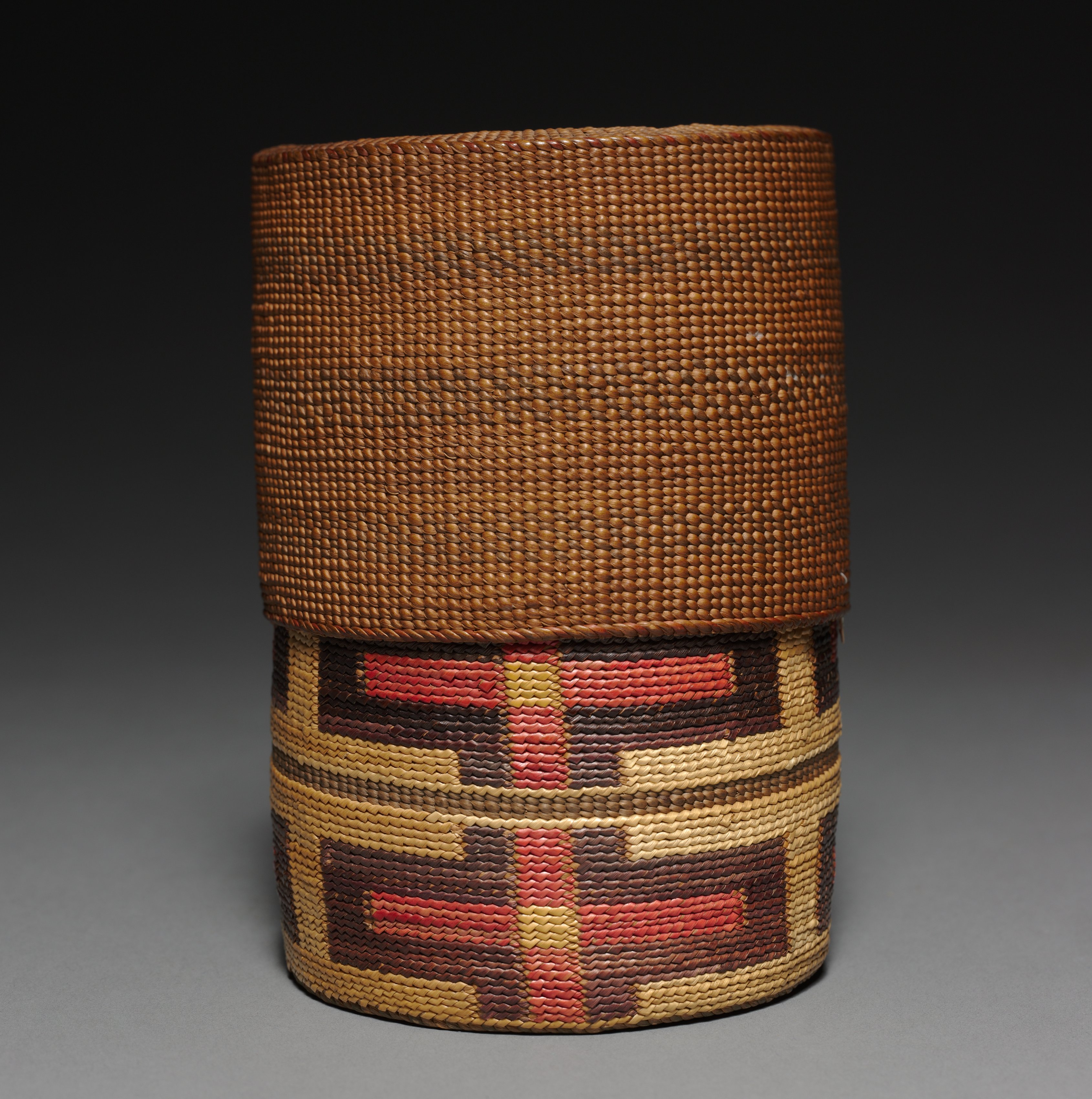 Cylindrical basket with a lid, made of woven material. The top portion of the basket and lid is a solid brown color, while the bottom portion features a pattern of red, yellow, and brown geometric shapes on a tan background. The basket is set against a dark gray background that gradually lightens towards the bottom. The overall shape is symmetrical, with the lid sitting directly on top of the base. The artist's work is titled "Telescoping basket".