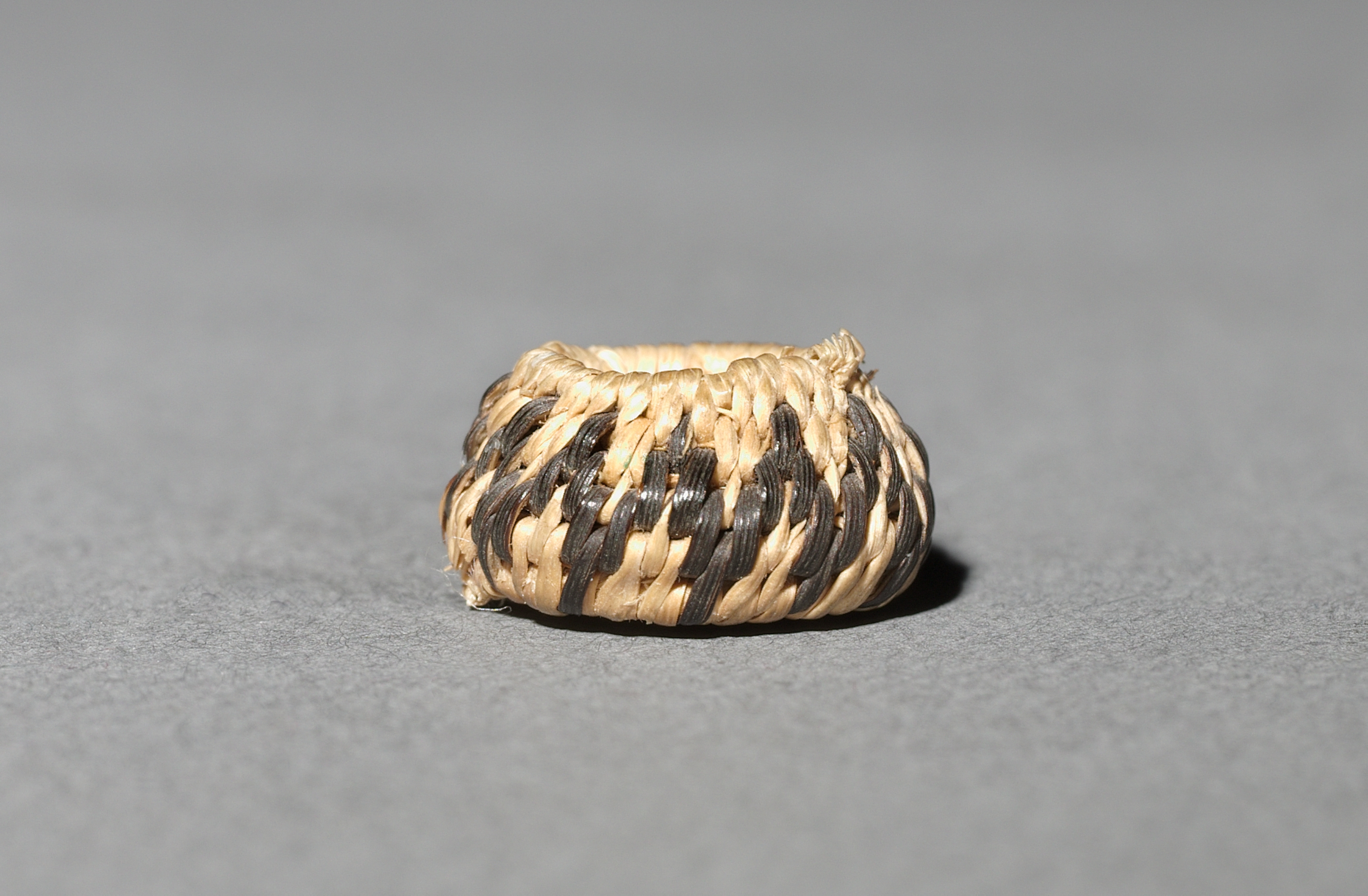 The Miniature Round Basket by the artist is a small, woven basket. The basket has a rounded shape and is made from light-colored fibers, possibly straw or reeds, woven together in a pattern. The woven pattern consists of alternating light and dark strips. The basket's opening is small and slightly irregular. The background of the image is a plain gray surface, providing a neutral backdrop that highlights the basket's details.