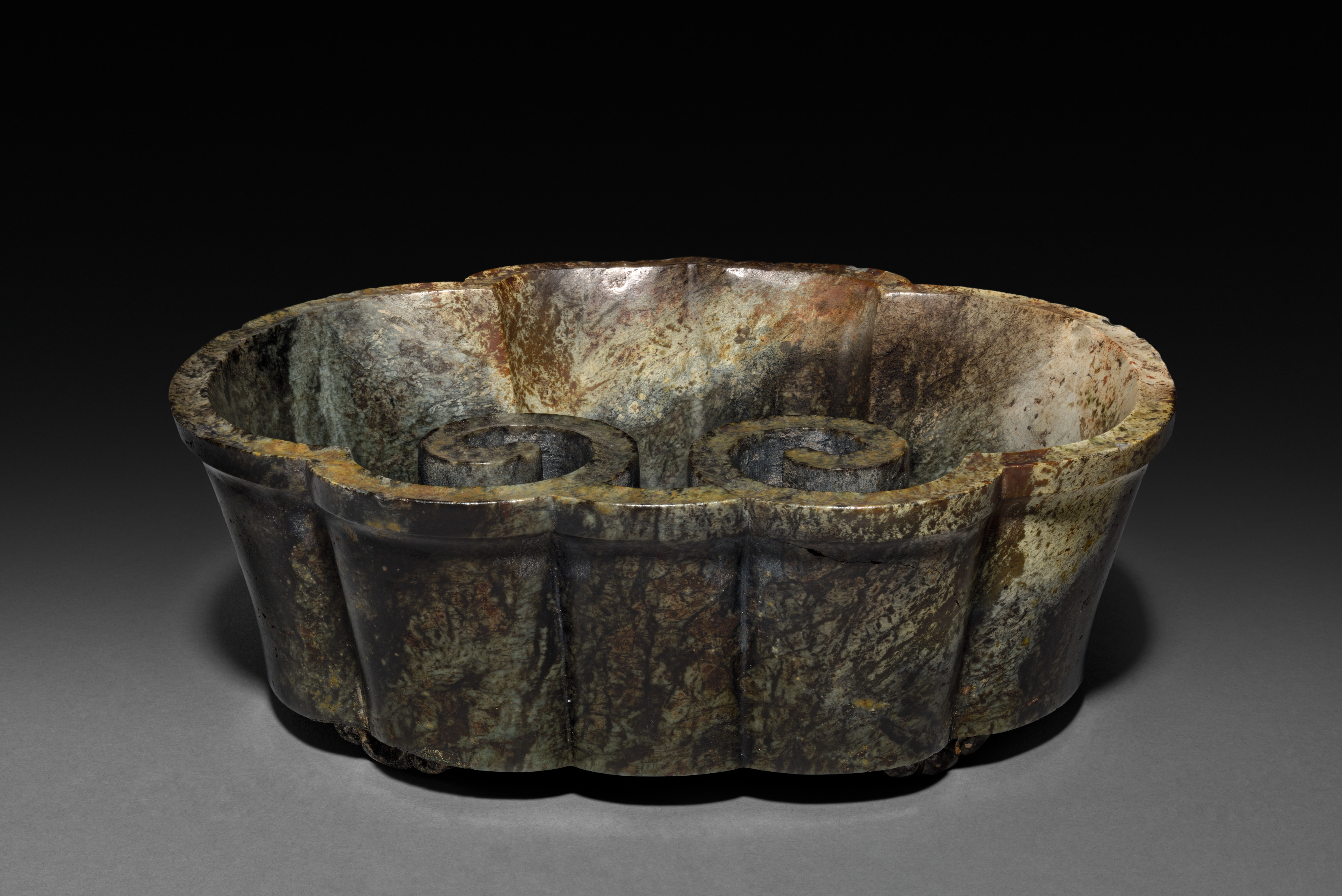 The image depicts a stone bowl titled "Fish Bowl" by an unidentified artist. The bowl is made of dark-colored stone with shades of green, brown, and white. It has a wide mouth and a scalloped edge around its top. The exterior of the bowl features vertical ridges and grooves. The interior of the bowl is smooth and glossy. The bowl has a small lip around its edge. The bowl's base is not visible. The background is a gradient from black at the top to gray at the bottom. The bowl casts a shadow on the surface below it. The overall appearance suggests an ancient or antique piece.