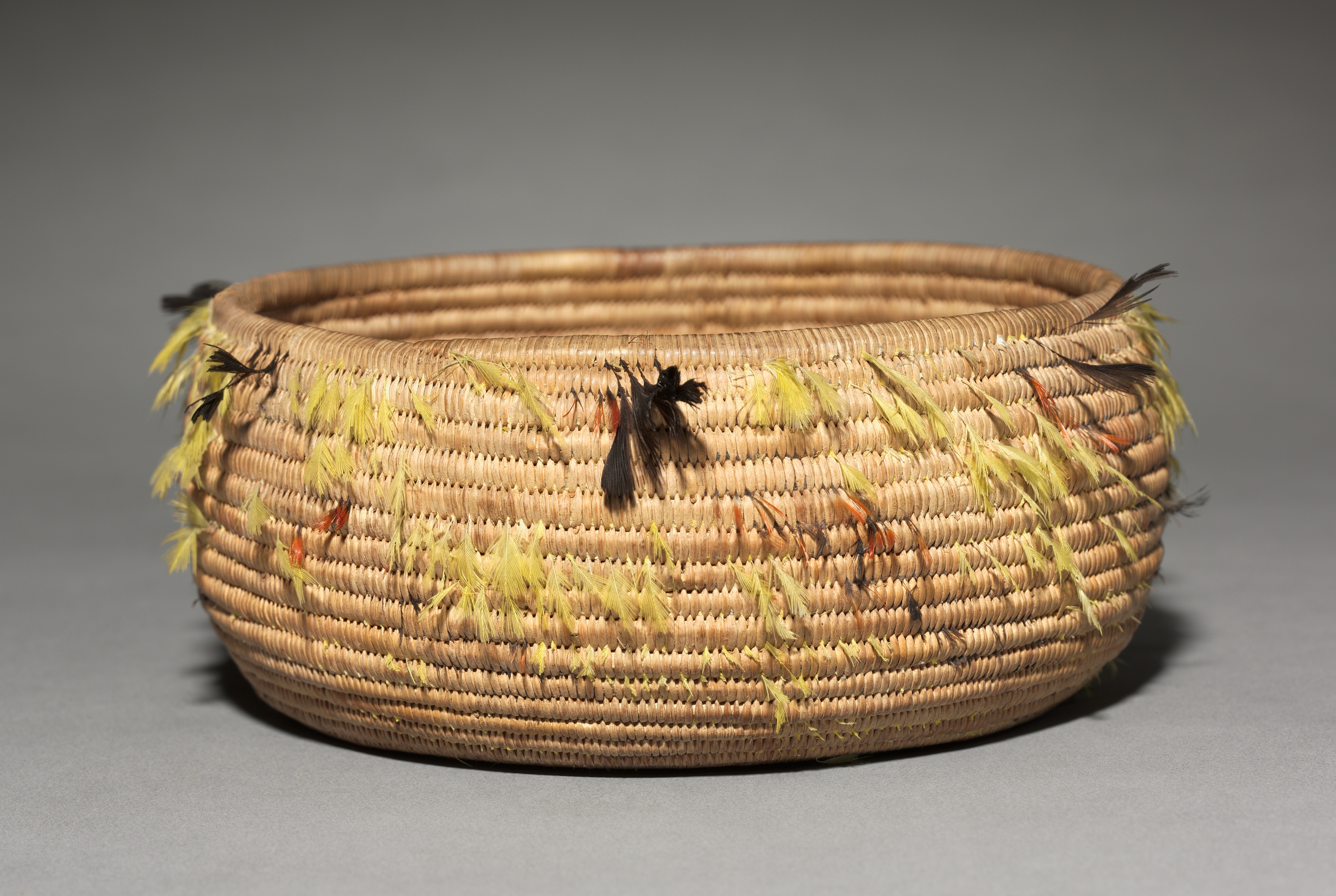 The Gift Bowl by an unknown artist is a light brown woven basket with a wide mouth and a rounded body. The basket features horizontal rows of woven material, with a decorative band around the middle. The decorative band consists of yellow, orange, and black feathers or threads woven into the basket. The basket sits on a gray surface with a darker gray background.