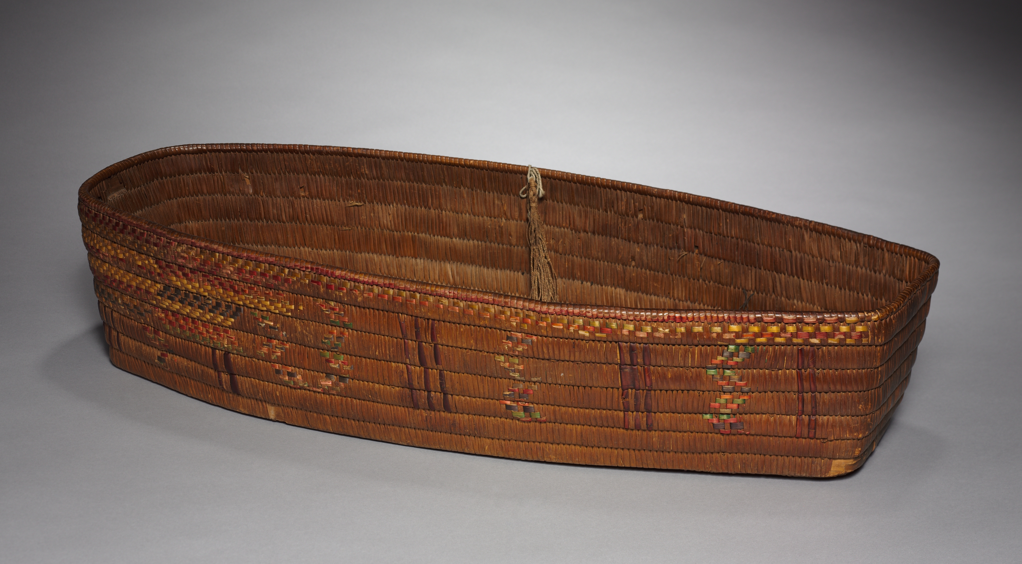 The Baby Basket by an unknown artist shows a woven basket with a long, oval shape and no lid. The basket's body is made of numerous thin, horizontal strips of brown material, possibly wood or plant fibers, woven together. A decorative pattern of red, orange, yellow, and green hues is visible on the exterior. The interior appears to be a lighter shade of brown. A thin rope or cord is visible at the top edge, possibly used for carrying or hanging. The background is a plain gray color with a subtle shadow cast by the basket.