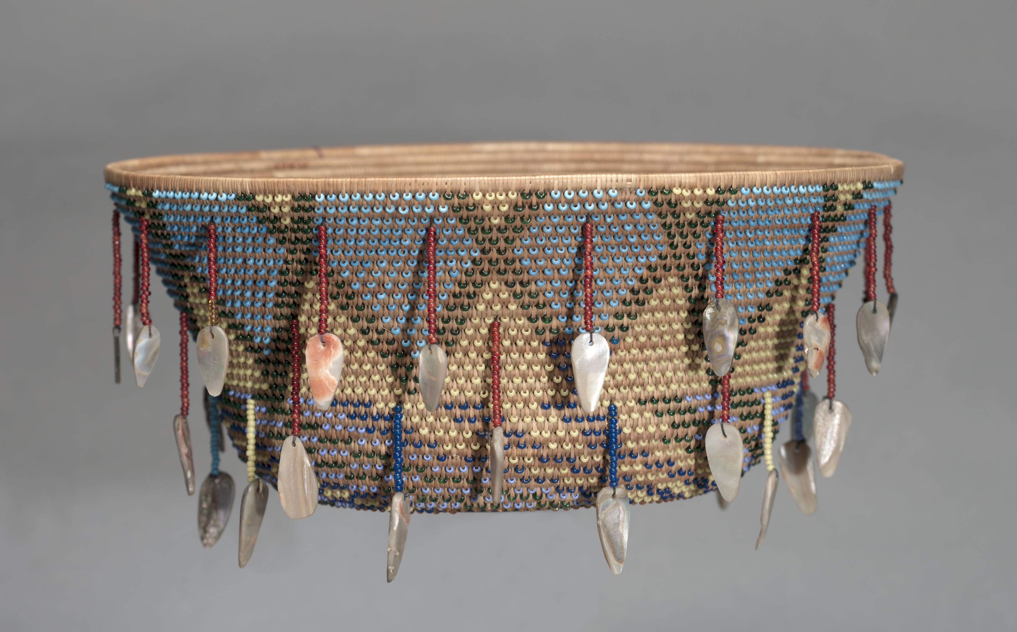 Gift Bowl by Simon Moya. This is a woven bowl made from natural fibers. The bowl features a woven design with a combination of blue, green, red, and yellow beads and sequins. The bowl has a flat top and a wide mouth. A rim of thin, light-colored wood or bamboo encircles the top edge. Red strings with white shell or mother-of-pearl teardrop-shaped pendants hang from the bottom. The background is gray.