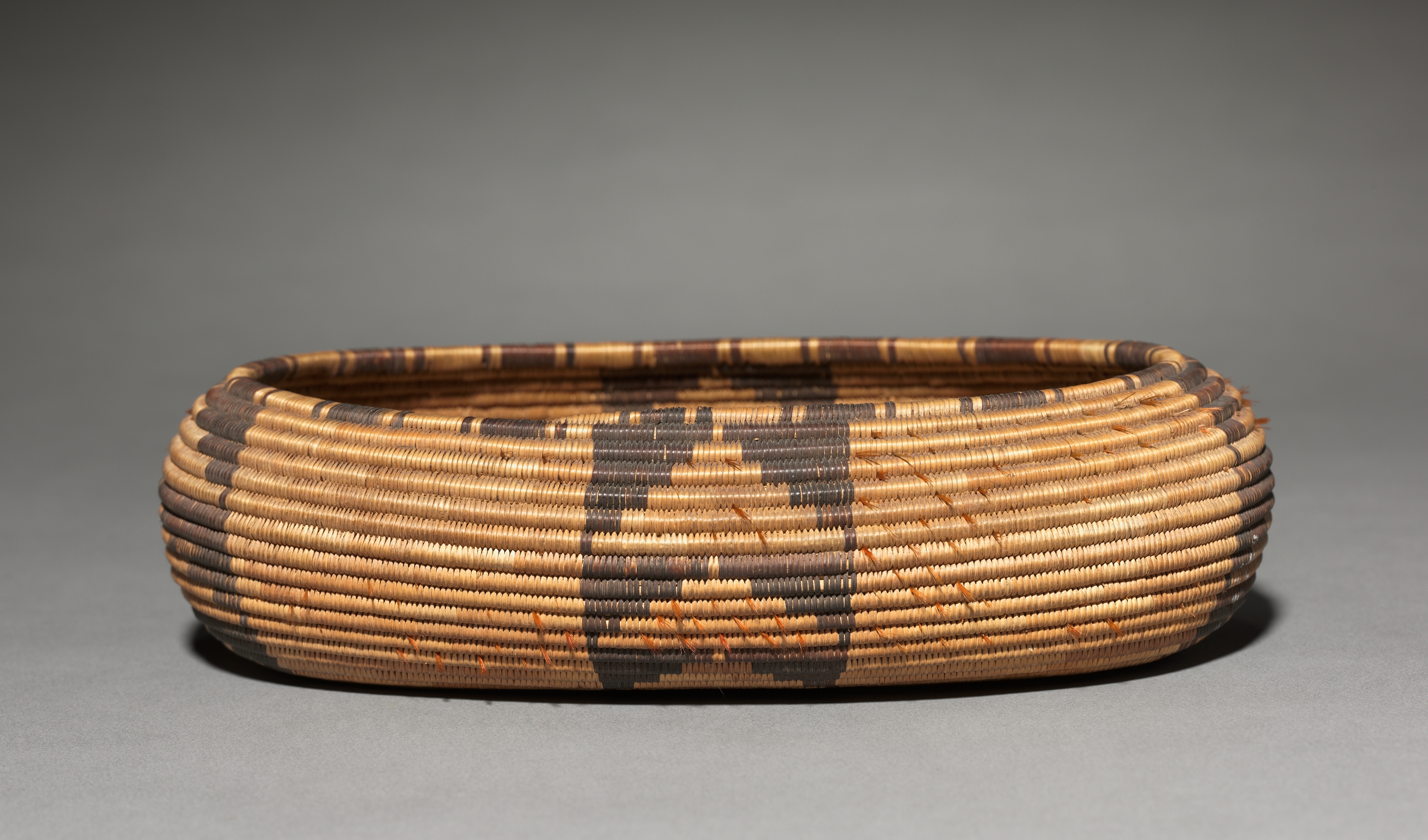 The Gift Bowl, Canoe-Shaped, is a woven basket with a canoe-like shape, featuring a rounded body and an open top. The basket's body is made of numerous thin, tightly coiled strips of light brown material, likely wicker or rattan, with darker brown stripes and geometric designs woven throughout. The basket's exterior and interior surfaces are visible, showcasing the intricate weaving pattern. The background is a plain gray surface with a subtle shadow cast by the basket.