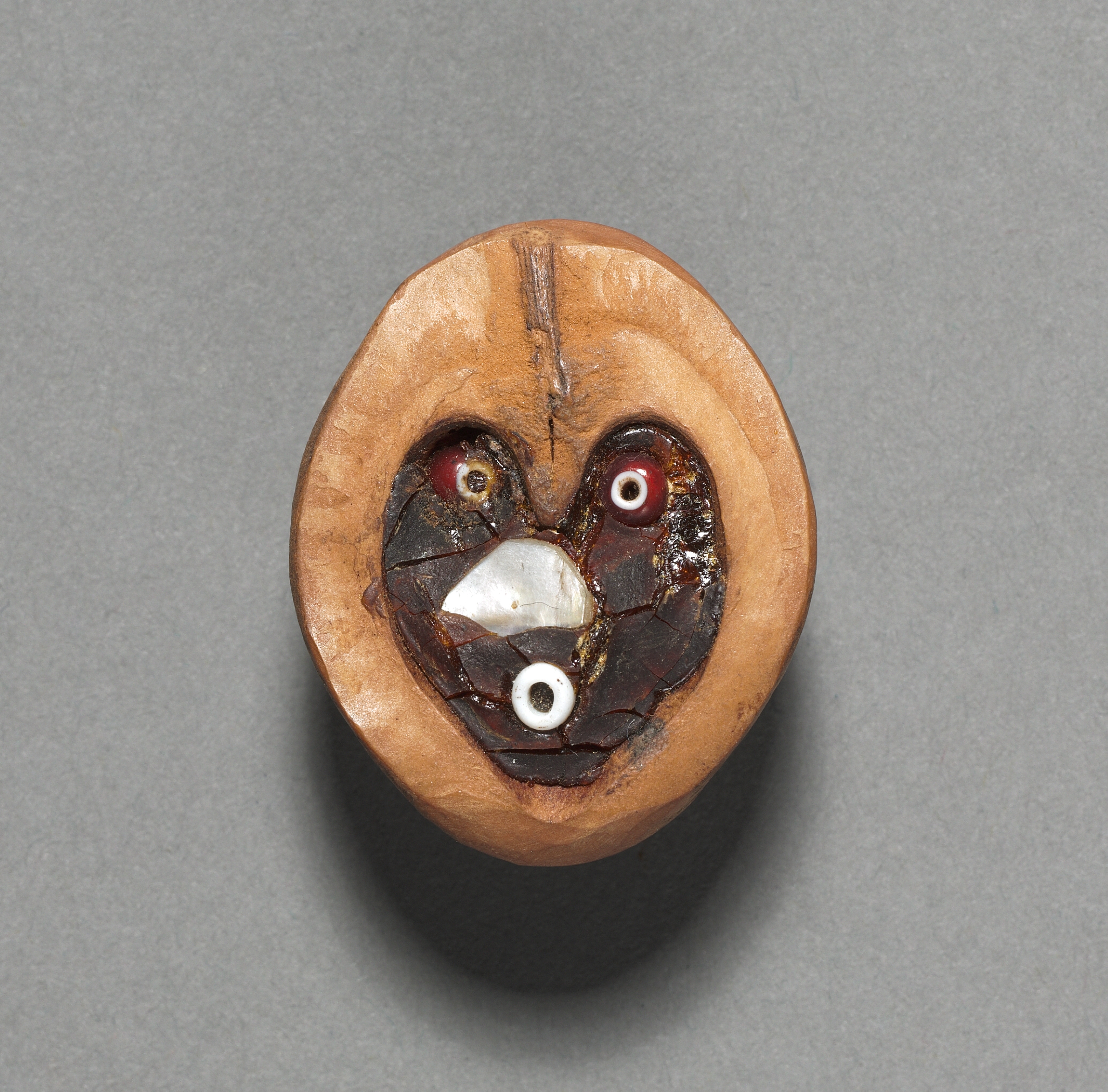 A circular wooden object with a flat top and rounded bottom, resembling a disc or puck. The top surface is light brown with a darker brown, cracked design in the center resembling a face. The face design features two circular red eyes with white and black centers, one white semicircle for a nose, and one white circle for a mouth. The object sits on a gray background with a shadow underneath. The object titled 'Gambling Dice' is by an unknown artist.