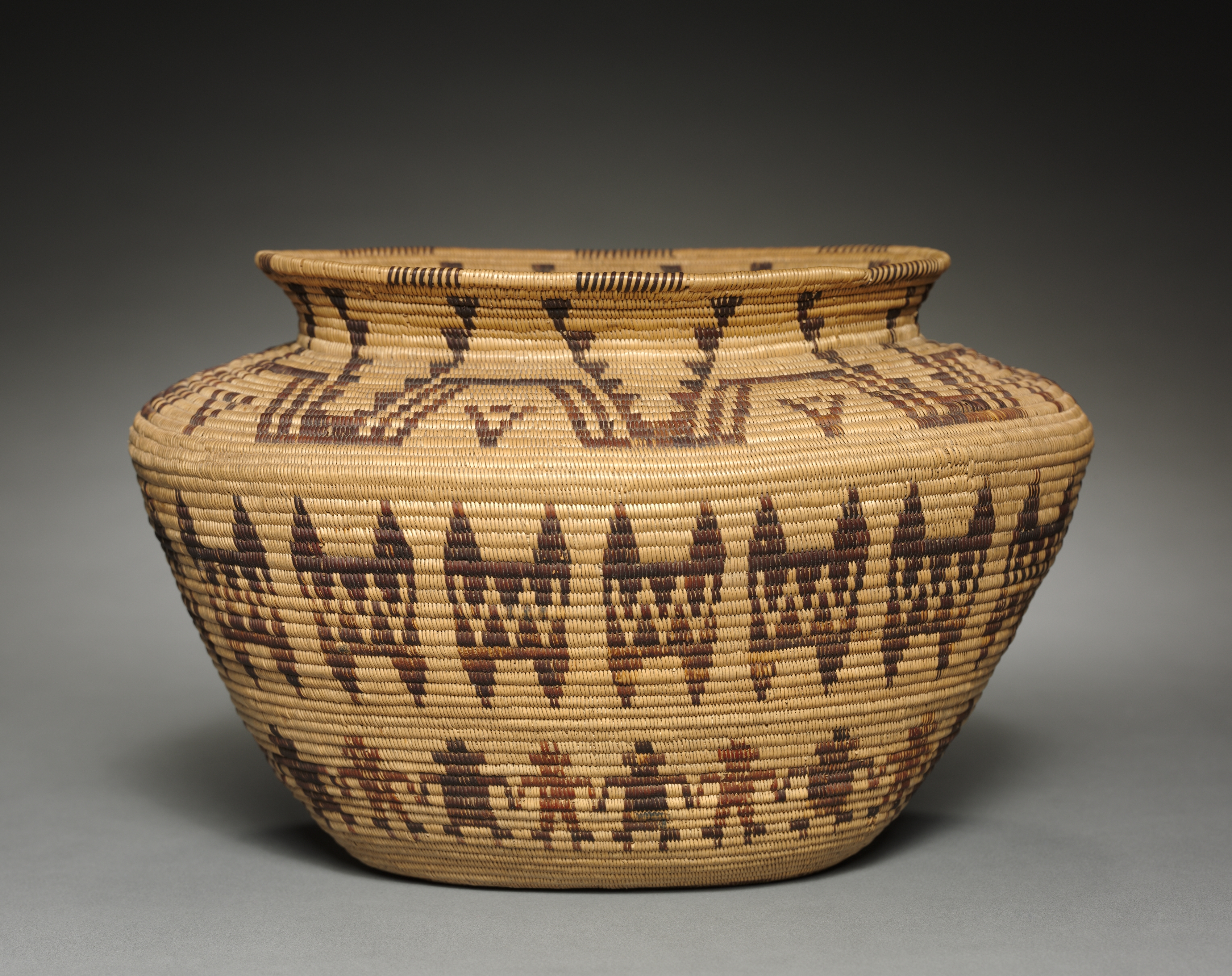 Jar-shaped basket by the artist, made from woven fibers, primarily tan in color with brown geometric designs. The basket has a wide body that curves inward to form a short neck and a small mouth. The body is widest at the middle, tapering slightly towards the bottom. The geometric pattern consists of triangles and zigzag lines. The background of the image is dark gray, transitioning to light gray at the bottom.