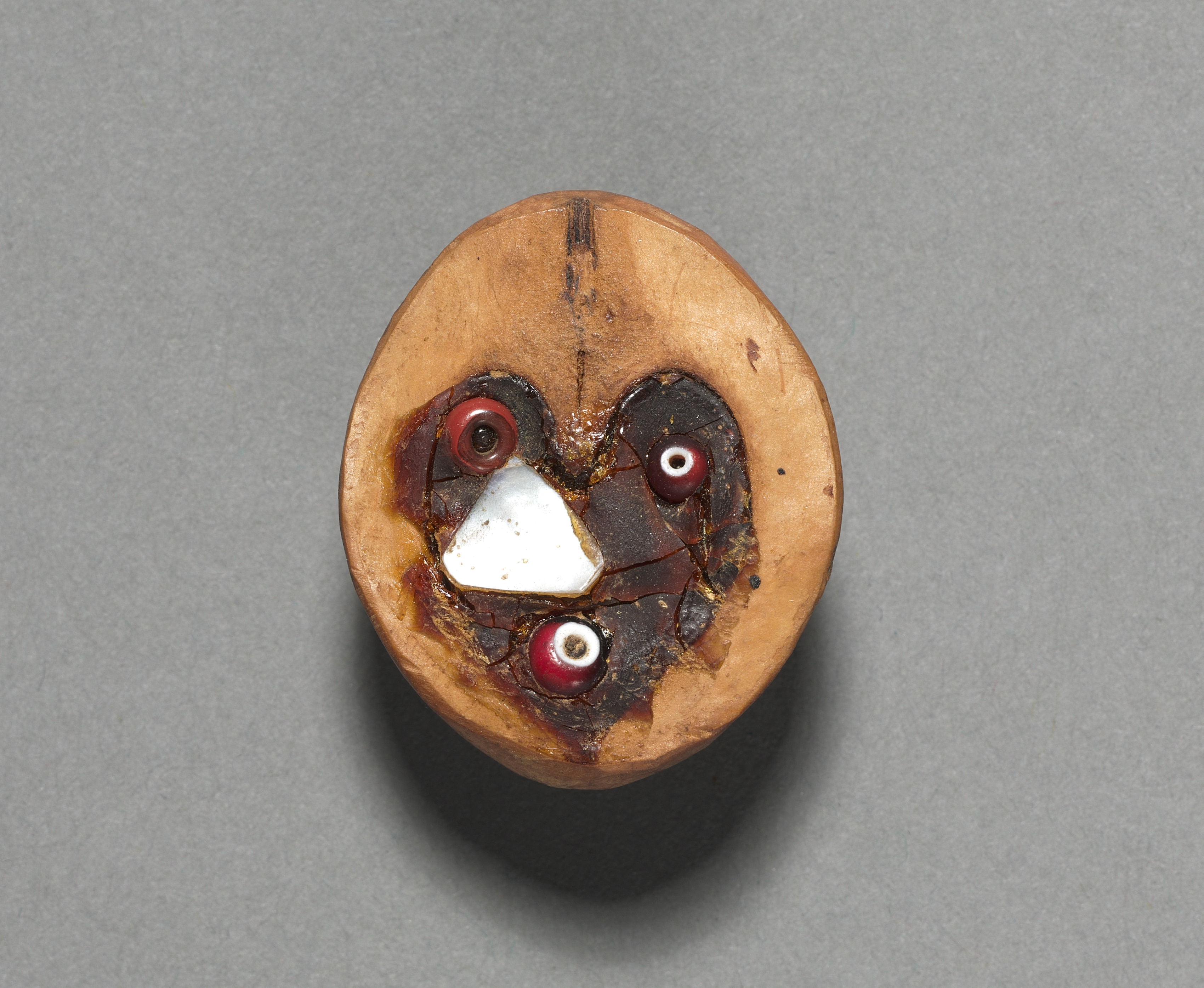 Round light-brown object with a flat top and a white triangular piece on it. The white piece is surrounded by dark-brown material with two small red circular objects on the left and right and one on bottom. The background is gray. The object is titled Gambling Dice by the artist.
