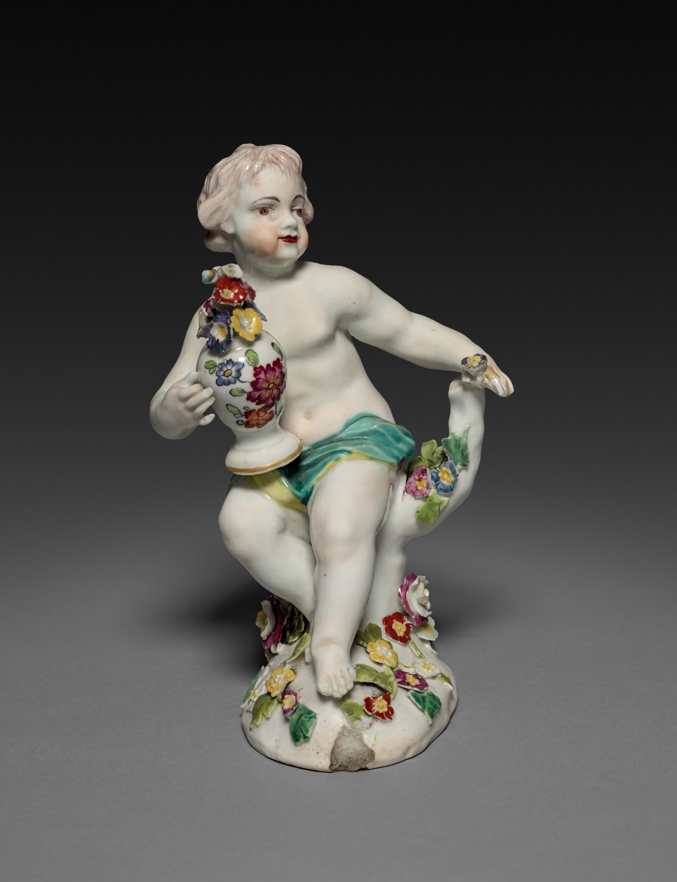 The porcelain figurine depicts a cherub with short blonde hair, wearing a green cloth wrapped around the waist. The cherub has a white complexion. The cherub sits on a curved object with one knee bent. The cherub holds a vase with floral design in the left hand and extends the right hand. The vase has a narrow base and a wide body with a floral design. The base of the figurine features a floral design. The background is dark grey. The title of the piece is "Spring".