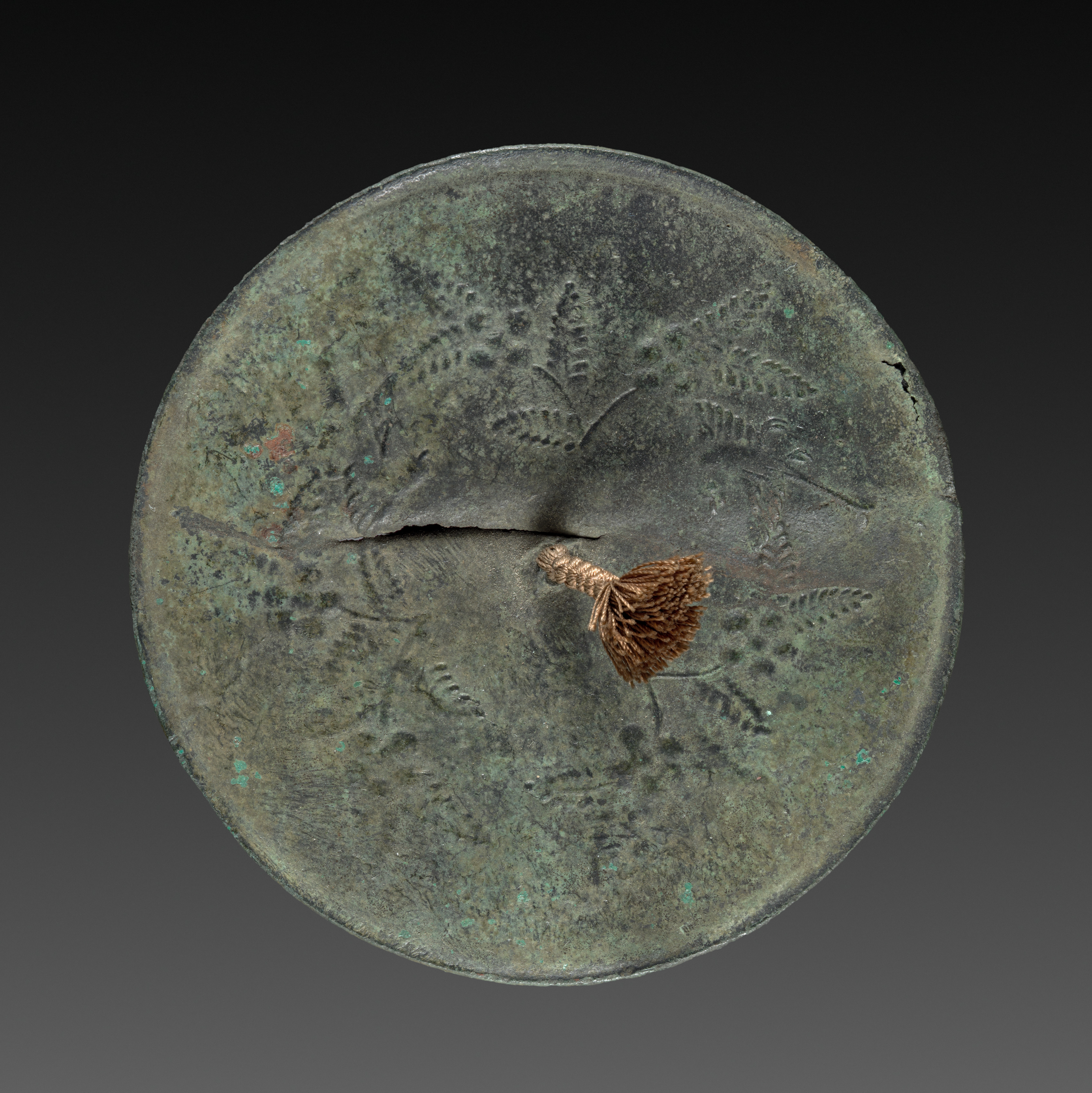 The artwork "Mirror" by an unknown artist depicts a round, weathered bronze object with a predominantly greenish-brown patina. The circular object displays signs of aging and wear, featuring a crack running across its center. A small, intricately designed bronze piece protrudes from the lower central part of the object. The surface of the object exhibits a textured pattern resembling leaves or feathers. The background of the image transitions from black at the top to dark gray at the bottom.