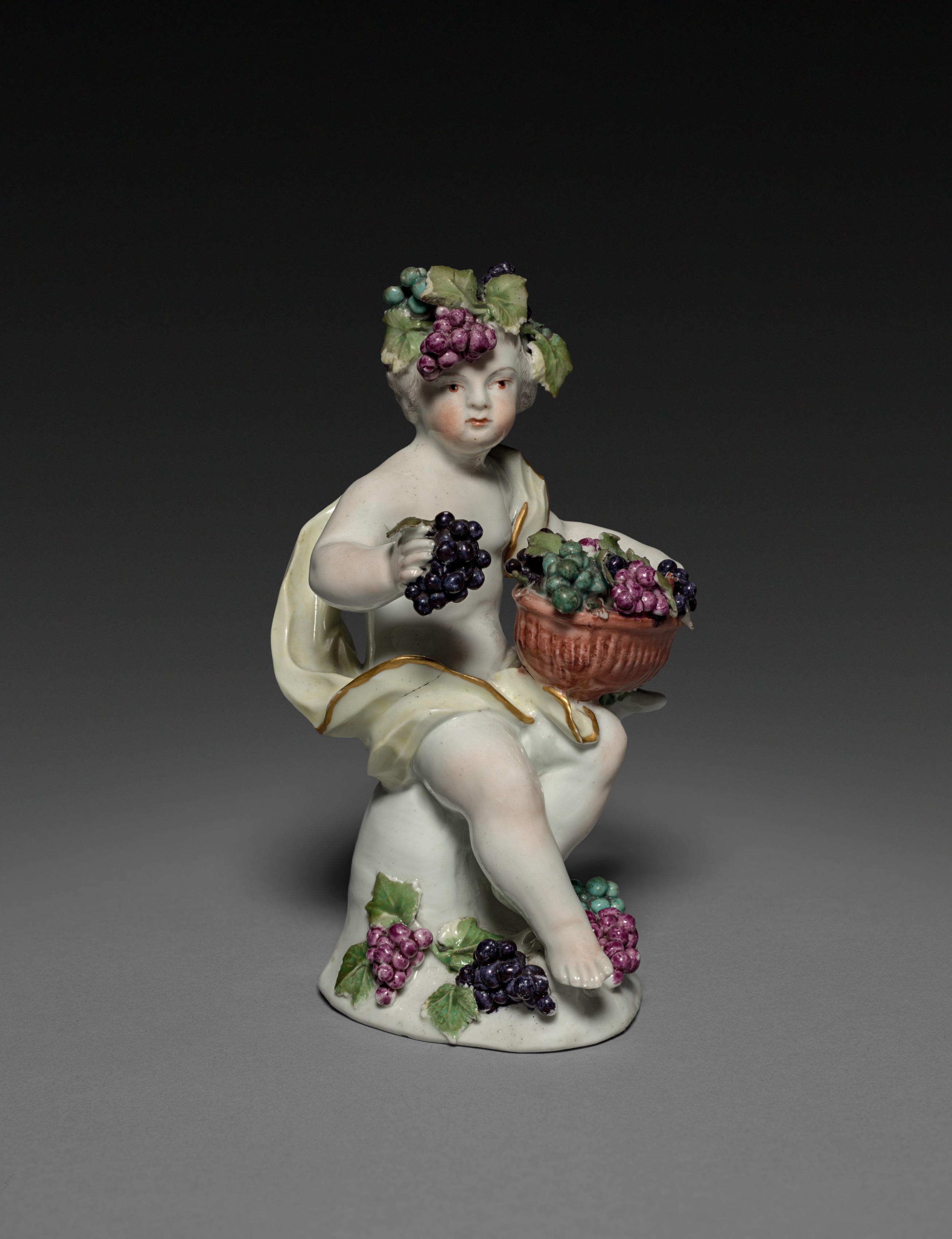 The ceramic figurine depicts a seated, nude child. The child has white skin with pink cheeks, short, curled white hair adorned with purple grapes and green leaves. The figure wears a cream-colored cloth draped over the left shoulder and wrapped around the waist with gold trim. The child sits on a base adorned with purple grapes and green leaves. In the right hand, the child holds a bunch of purple grapes. In the left hand, the child holds a brown basket filled with purple, pink, and green grapes and green leaves. The background is dark gray, transitioning to black at the top. The figurine represents "Autumn".
