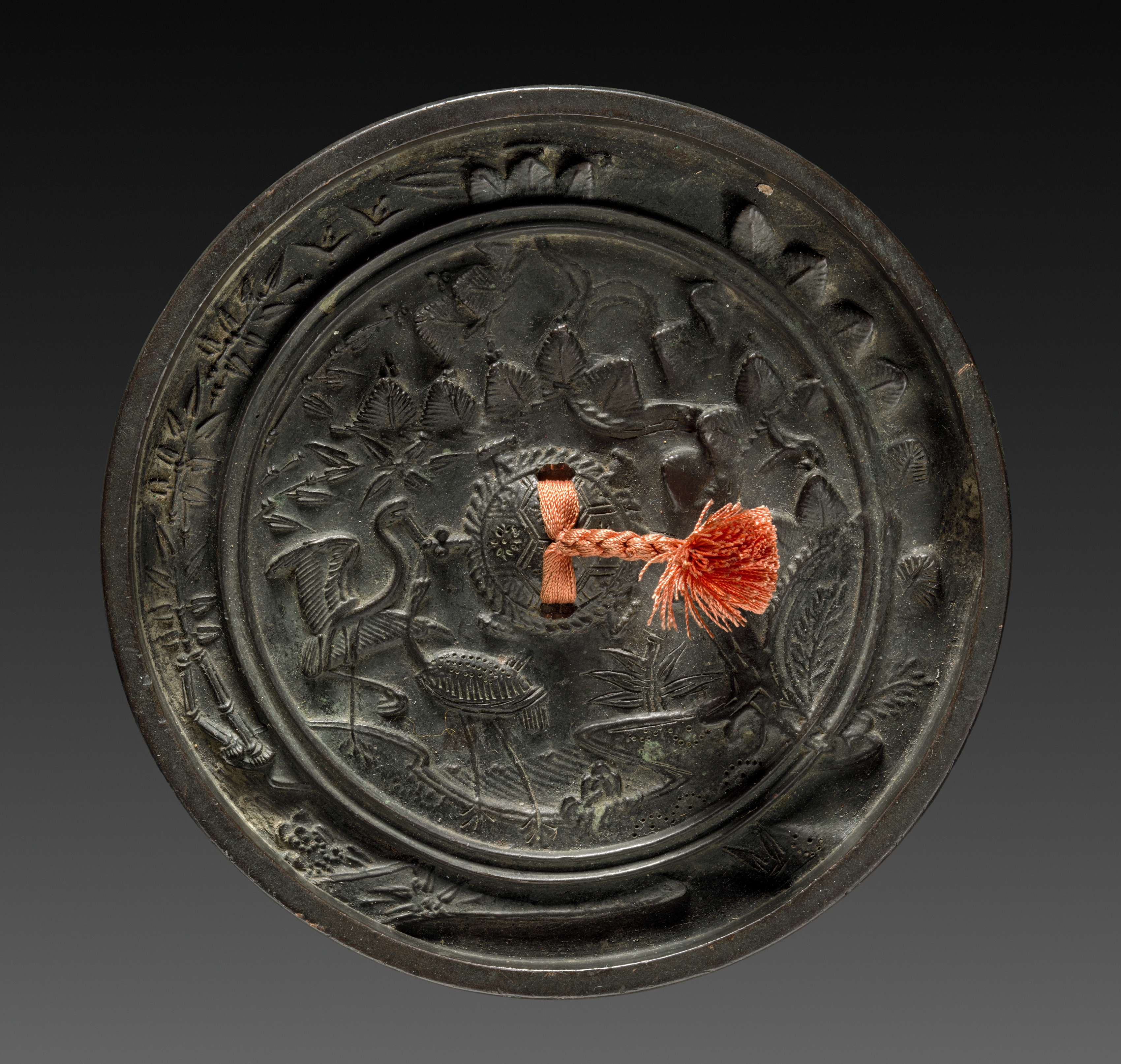 The image shows a round, dark-colored, metal object with a raised design. The object has a raised outer edge with a leaf pattern. Inside the outer edge is a raised circle with two cranes standing in a landscape with plants. The two cranes are on either side of a circular medallion. The medallion appears to have characters in it. There is an orange cord with a tassel threaded through a small hole at the top of the medallion. The background of the image is dark gray, becoming black at the top. The object titled "Mirror with Pair of Cranes in Landscape".