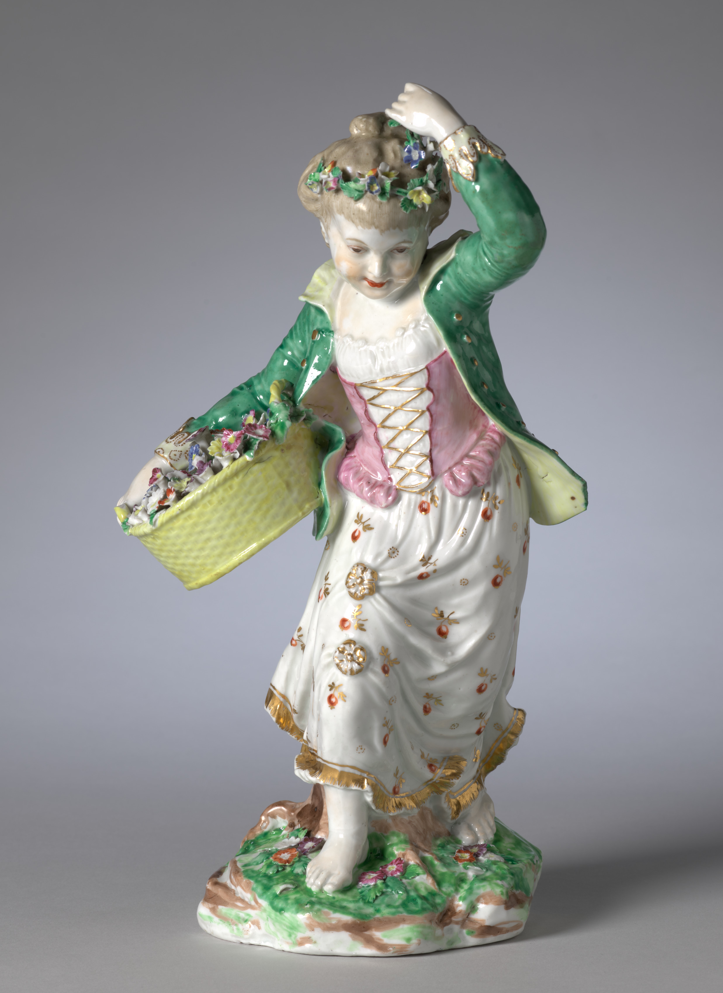 The image depicts a ceramic figurine of a woman wearing a white dress with a pink corset and green jacket. The woman has blonde hair adorned with a floral crown and holds a basket in her right hand while touching her hair with her left. The figurine stands on a base decorated with greenery and flowers. The woman's dress features a floral pattern, and her shoes are not visible. The background of the image is gray. The figurine represents spring.