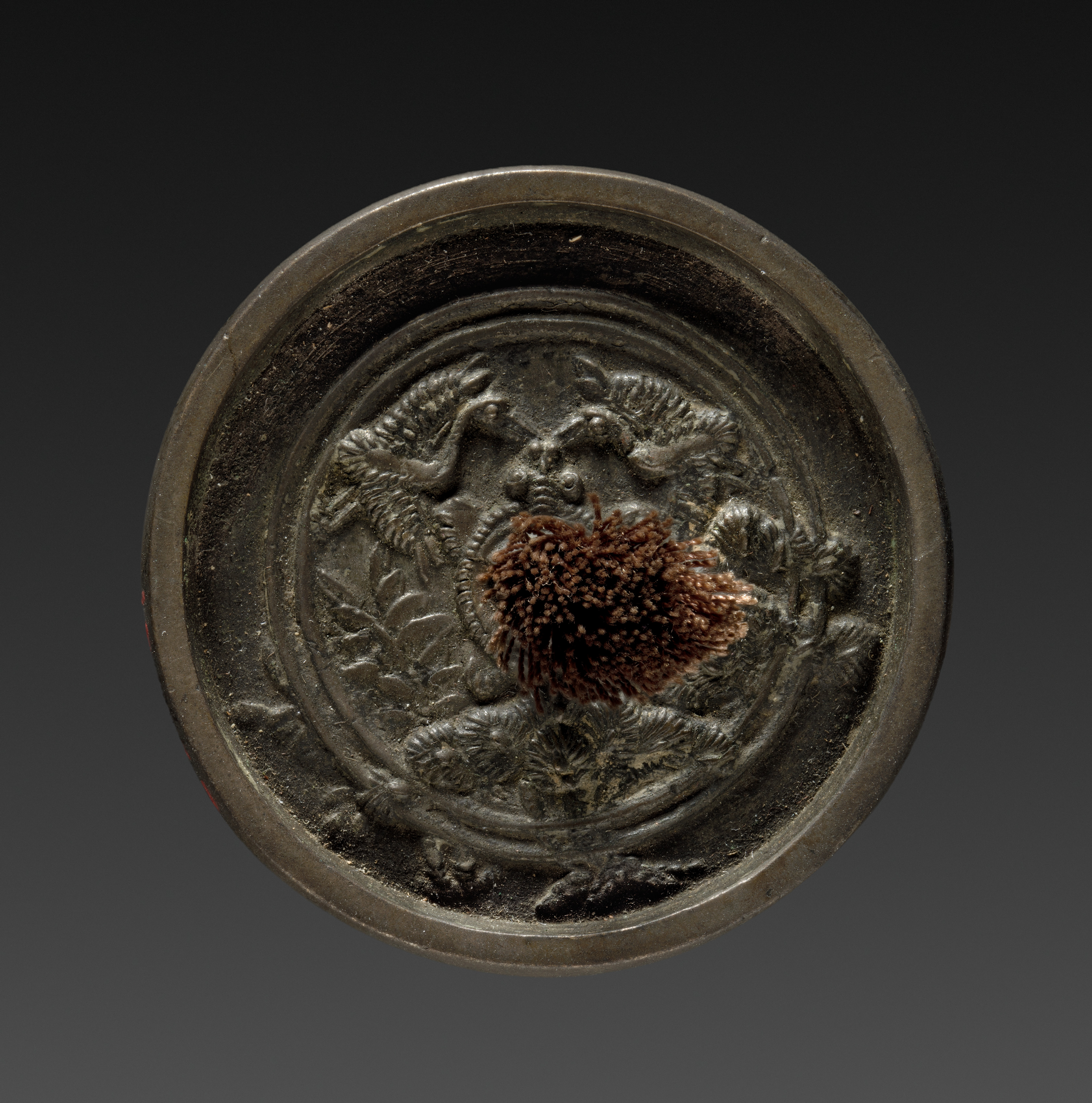 Dark gray, circular object with raised circular border, embossed with four figures around a central object. The object sits in the center of the image and against a gradient background. The object resembles a seal. The central object is a spiky mass taking up approximately the center third of the object. The four figures around the mass appear to have two wings and two tails; they appear to be holding up the mass. The object fills most of the image. The title is "Mirror" and the artist is unknown.