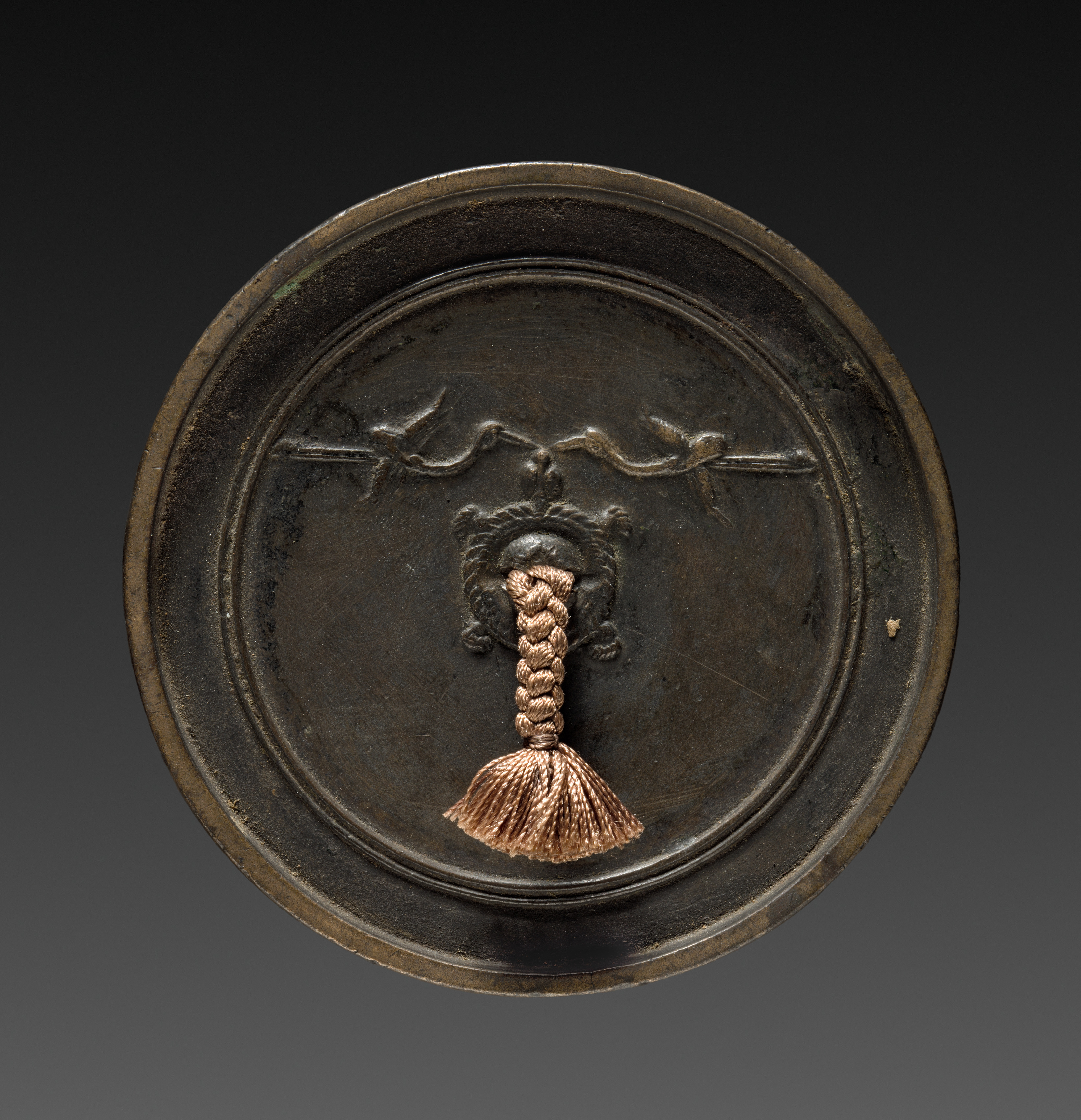 The image depicts a metalwork piece titled "Mirror" by an unknown artist. Dark brown metal circle with raised edge. Two birds on top; one faces left, the other right; they appear to be connected by a line above their heads. A horse's head and a tassel are centered. The horse's head faces forward; it has a long mane. A braid extends down from the horse's head, ending in a copper-colored tassel. The background is dark gray to black, transitioning from light at the bottom to dark at the top.