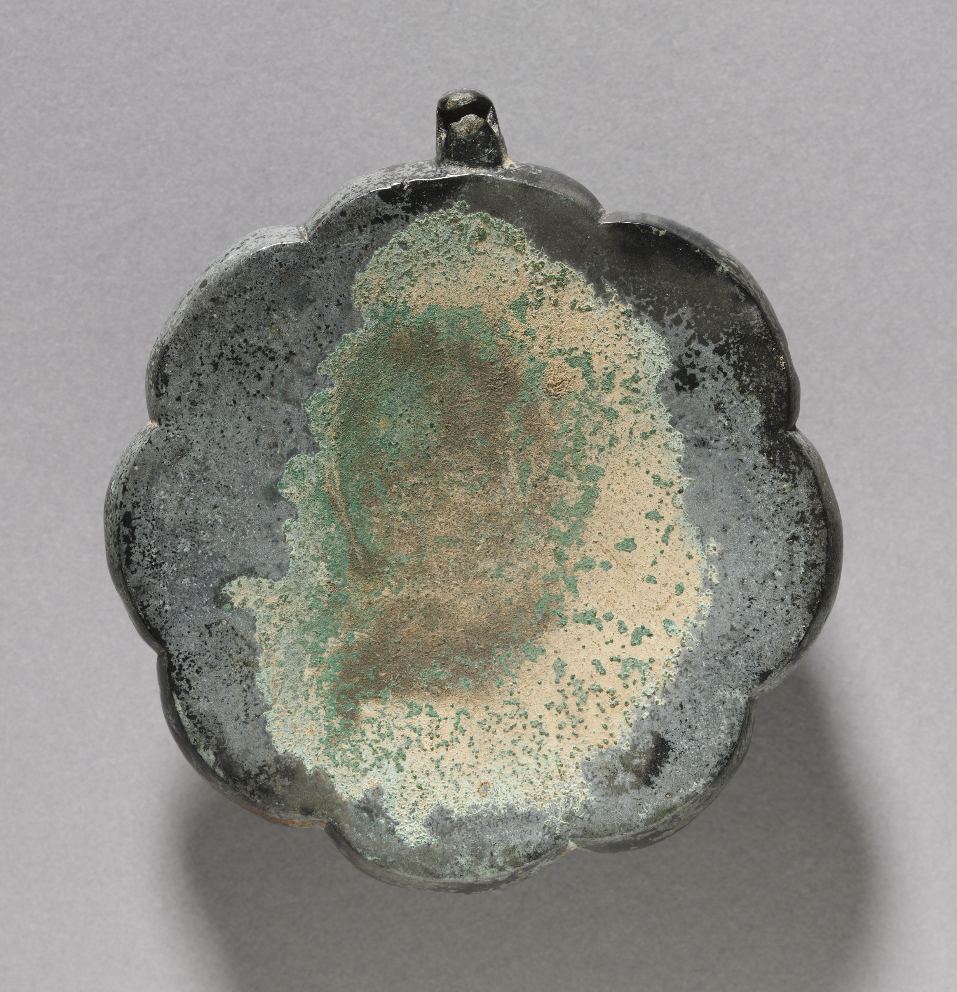 The image shows a flower-shaped mirror. The mirror is made of a metal that appears to be bronze or copper, with a scalloped edge resembling a flower. It has a small loop at the top, likely for hanging. The surface of the mirror is discolored with shades of green, brown, and tan, indicating oxidation or aging. The mirror's reflective surface is not smooth and even, with visible spots and patches. The background of the image is a plain gray color.