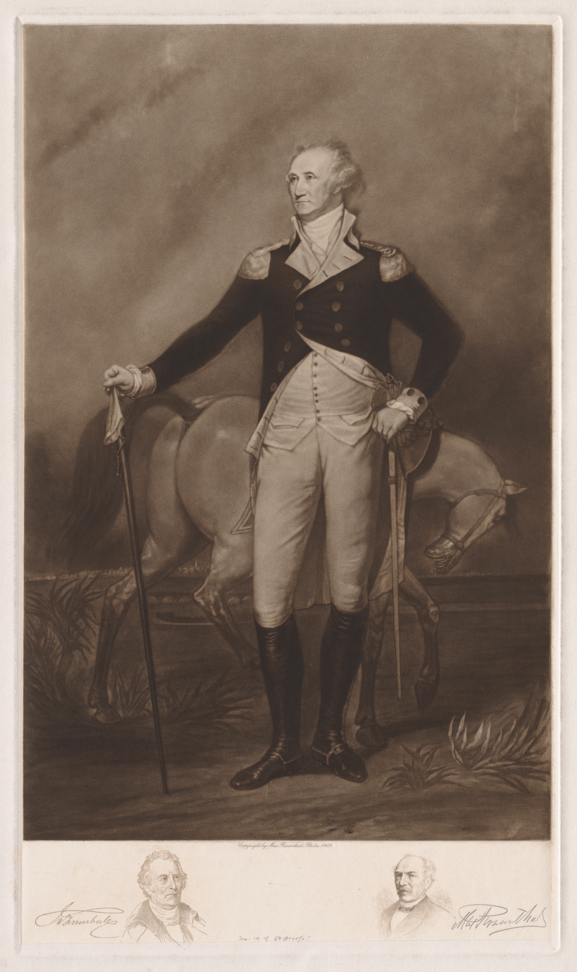 The image shows a sepia-toned portrait of George Washington. He is wearing a dark military jacket with gold epaulets on the shoulders, a white shirt with a folded collar, white breeches, and tall black boots. His hair is short and light-colored. He holds a walking stick in his right hand and has his left hand on his hip. Behind him, on the left, there is a horse. The horse's head is not visible. The background shows a cloudy sky and some foliage at the bottom. At the bottom of the image, there are two small portraits with signatures. The portrait on the left appears to be of George Washington, and the one on the right appears to be of the artist.