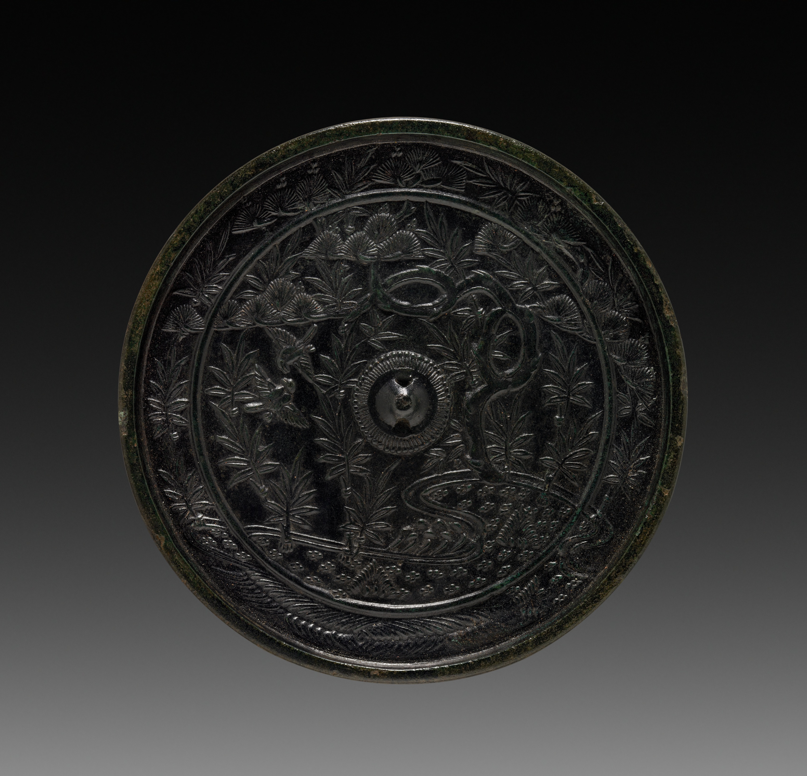 The Mirror by artist unknown, shows a circular, black, metal object with a raised edge and a central circular design. The object has a dark green patina around the edges. The central design features a raised circular pattern with a bird at its center, surrounded by raised, curved lines and leaves. The outer ring of the object has a repeating pattern of leaves and flowers. The background of the image is a gradient that transitions from black at the top to gray at the bottom.